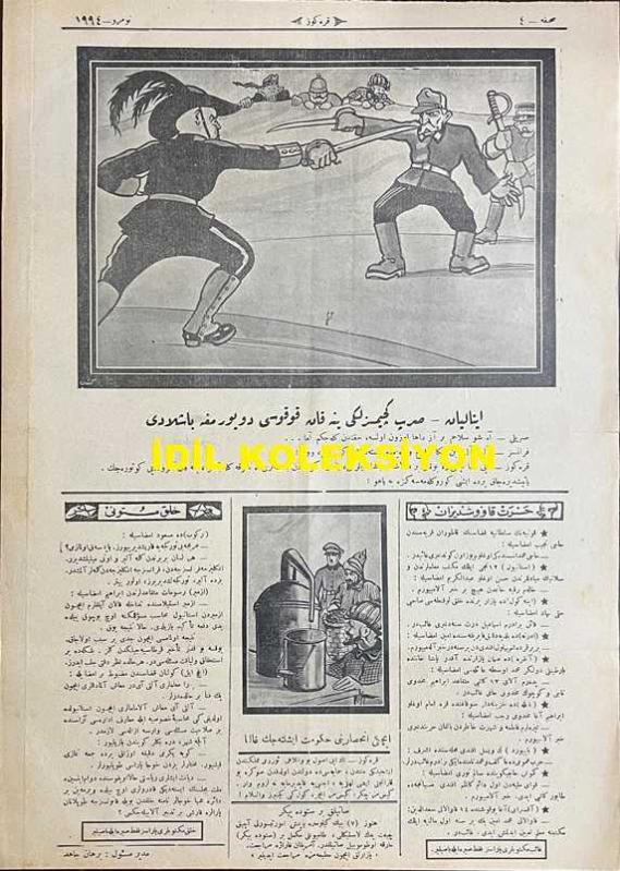 Osmanlıca Karagöz Mizah Dergisi-Gazetesi, Orijinal Dönem Basım, (Ottoman Magazine-Newspaper-Journal Illustré Cara-Gueuz) - 27 Nisan 1927 - Sayı: 1994 - Karikatür: Bütün Devletler Silah Fabrikalarını Yağma Edercesine Silahlanıyorlar! "Fabrikatör: Acele Etmeyin Yahu! Ne Varsa Verdik. Boyacı Küpü Değil ki Daldırıp Çıkarıp Silah Yapalım. Karagöz: Ar Yılı Değil Kar Yılı Birader, Baksana Hepsi Depolarını Tüfek, Bomba, Top, Mitralyözle Dolduruyor, Tayyarelerden Ordu, Zırhlılardan Donanma Yapıyorlar. Bu Sıcağa Kar mı Dayanır!" - Fotoğraf: İstanbul'da Çocuk Bayramı: Kız Lisesi Sporcu Talebelerinin Geçit Resmi - Fotoğraf: İzmir'de Çocuk Bayramı Merasiminden, Himaye-i Etfal Reisi Ethem Bey ve Bir Grup - Karikatür: İtalyan-Sırp Geçimsizliği Yine Kan Kokusu Duyurmaya Başladı - Karikatür: İçki İnhisarını Hükümet İşletecek Galiba adlı eser, Kitap > Süreli Yayınlar > Gazeteler > Türkiye > Genel kategorisinde İkinci El olarak satıştadır.