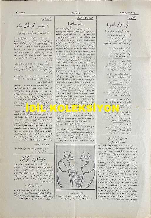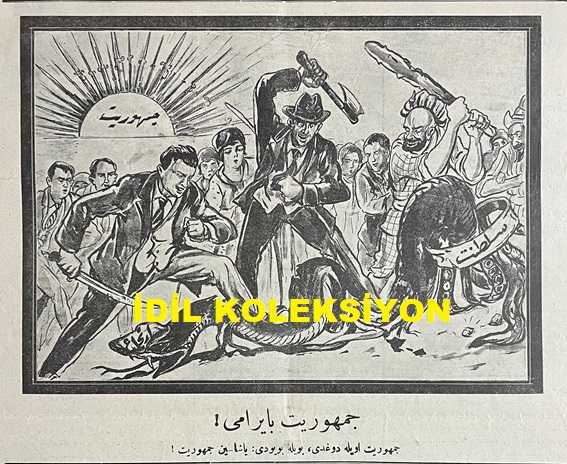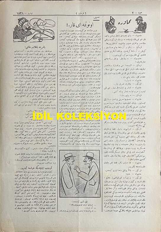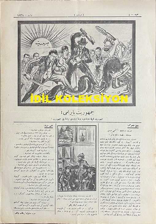 Osmanlıca Karagöz Mizah Dergisi-Gazetesi, Orijinal Dönem Basım, (Ottoman Magazine-Newspaper-Journal Illustré Cara-Gueuz) - 28 Ekim (Teşrin-i Evvel) 1925 - Sayı: 1838 - Hicri: 9 Rebiülahir 1344 - Karikatür: Gücü Gücü Yetene mi? "Pangalos: Ah Vire, Diyavlo, Vurazayim Bir Tekme, Gebertezeyim Bu Gospodini! Karagöz: Hey Barba Pangalo. Ona Tekme Vurmadan Evvel Arkana Bak. Hem Daha Sırtındaki Tekmenin İzi Bile Silinmemiş! - İrticaya Karşı Mücadele Temalı Cumhuriyet Bayramı'na Özel Karikatür: Cumhuriyet Bayramı! "Cumhuriyet Öyle Doğdu, Böyle Büyüdü: Yaşasın Cumhuriyet!" - Karikatür: "İçlerinde Bir Yaramazın Muallimin Sandalyesine Çuvaldız Koymasından Dolayı Sınıfça Kırk Beşi Birden Sokağa Atılan Talebe Ötede Beride Sürünüyorlarmış" Bu Kadarı da Olmaz Yahu! "Karagöz: Hey Mektep Müdürü Bey, Aç Kapıyı da Bu Yavrucakları İçeriye Al. Ben O Yaramaz, Haylaz Kabahatliyi Bulur, Size Teslim Ederim", Burhan Cahit (MORKAYA) tarafından kaleme alınmıştır. Kitap 1925 yılında Ali Fuat ve Şürekası Karagöz Gazetesi Şirketi tarafından [İstanbul] yayınlanmıştır. Satışta olan kitap, yayınevinin 1.838. baskısıdır. 4 sayfadır. Osmanlıca Karagöz Mizah Dergisi-Gazetesi, Orijinal Dönem Basım, (Ottoman Magazine-Newspaper-Journal Illustré Cara-Gueuz) - 28 Ekim (Teşrin-i Evvel) 1925 - Sayı: 1838 - Hicri: 9 Rebiülahir 1344 - Karikatür: Gücü Gücü Yetene mi? "Pangalos: Ah Vire, Diyavlo, Vurazayim Bir Tekme, Gebertezeyim Bu Gospodini! Karagöz: Hey Barba Pangalo. Ona Tekme Vurmadan Evvel Arkana Bak. Hem Daha Sırtındaki Tekmenin İzi Bile Silinmemiş! - İrticaya Karşı Mücadele Temalı Cumhuriyet Bayramı'na Özel Karikatür: Cumhuriyet Bayramı! "Cumhuriyet Öyle Doğdu, Böyle Büyüdü: Yaşasın Cumhuriyet!" - Karikatür: "İçlerinde Bir Yaramazın Muallimin Sandalyesine Çuvaldız Koymasından Dolayı Sınıfça Kırk Beşi Birden Sokağa Atılan Talebe Ötede Beride Sürünüyorlarmış" Bu Kadarı da Olmaz Yahu! "Karagöz: Hey Mektep Müdürü Bey, Aç Kapıyı da Bu Yavrucakları İçeriye Al. Ben O Yaramaz, Haylaz Kabahatliyi Bulur, Size Teslim Ederim" adlı eser Osmanlıca dilindedir.