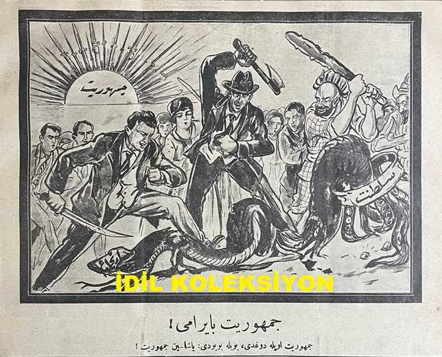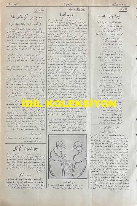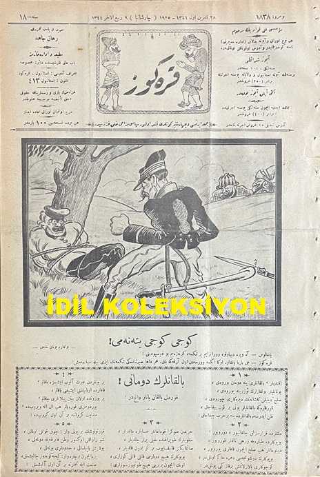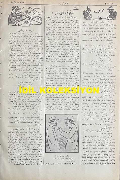 Osmanlıca Karagöz Mizah Dergisi-Gazetesi, Orijinal Dönem Basım, (Ottoman Magazine-Newspaper-Journal Illustré Cara-Gueuz) - 28 Ekim (Teşrin-i Evvel) 1925 - Sayı: 1838 - Hicri: 9 Rebiülahir 1344 - Karikatür: Gücü Gücü Yetene mi? "Pangalos: Ah Vire, Diyavlo, Vurazayim Bir Tekme, Gebertezeyim Bu Gospodini! Karagöz: Hey Barba Pangalo. Ona Tekme Vurmadan Evvel Arkana Bak. Hem Daha Sırtındaki Tekmenin İzi Bile Silinmemiş! - İrticaya Karşı Mücadele Temalı Cumhuriyet Bayramı'na Özel Karikatür: Cumhuriyet Bayramı! "Cumhuriyet Öyle Doğdu, Böyle Büyüdü: Yaşasın Cumhuriyet!" - Karikatür: "İçlerinde Bir Yaramazın Muallimin Sandalyesine Çuvaldız Koymasından Dolayı Sınıfça Kırk Beşi Birden Sokağa Atılan Talebe Ötede Beride Sürünüyorlarmış" Bu Kadarı da Olmaz Yahu! "Karagöz: Hey Mektep Müdürü Bey, Aç Kapıyı da Bu Yavrucakları İçeriye Al. Ben O Yaramaz, Haylaz Kabahatliyi Bulur, Size Teslim Ederim", Burhan Cahit (MORKAYA) tarafından kaleme alınmıştır. Kitap 1925 yılında Ali Fuat ve Şürekası Karagöz Gazetesi Şirketi tarafından [İstanbul] yayınlanmıştır. Satışta olan kitap, yayınevinin 1.838. baskısıdır. 4 sayfadır. Osmanlıca Karagöz Mizah Dergisi-Gazetesi, Orijinal Dönem Basım, (Ottoman Magazine-Newspaper-Journal Illustré Cara-Gueuz) - 28 Ekim (Teşrin-i Evvel) 1925 - Sayı: 1838 - Hicri: 9 Rebiülahir 1344 - Karikatür: Gücü Gücü Yetene mi? "Pangalos: Ah Vire, Diyavlo, Vurazayim Bir Tekme, Gebertezeyim Bu Gospodini! Karagöz: Hey Barba Pangalo. Ona Tekme Vurmadan Evvel Arkana Bak. Hem Daha Sırtındaki Tekmenin İzi Bile Silinmemiş! - İrticaya Karşı Mücadele Temalı Cumhuriyet Bayramı'na Özel Karikatür: Cumhuriyet Bayramı! "Cumhuriyet Öyle Doğdu, Böyle Büyüdü: Yaşasın Cumhuriyet!" - Karikatür: "İçlerinde Bir Yaramazın Muallimin Sandalyesine Çuvaldız Koymasından Dolayı Sınıfça Kırk Beşi Birden Sokağa Atılan Talebe Ötede Beride Sürünüyorlarmış" Bu Kadarı da Olmaz Yahu! "Karagöz: Hey Mektep Müdürü Bey, Aç Kapıyı da Bu Yavrucakları İçeriye Al. Ben O Yaramaz, Haylaz Kabahatliyi Bulur, Size Teslim Ederim" adlı eser Osmanlıca dilindedir.