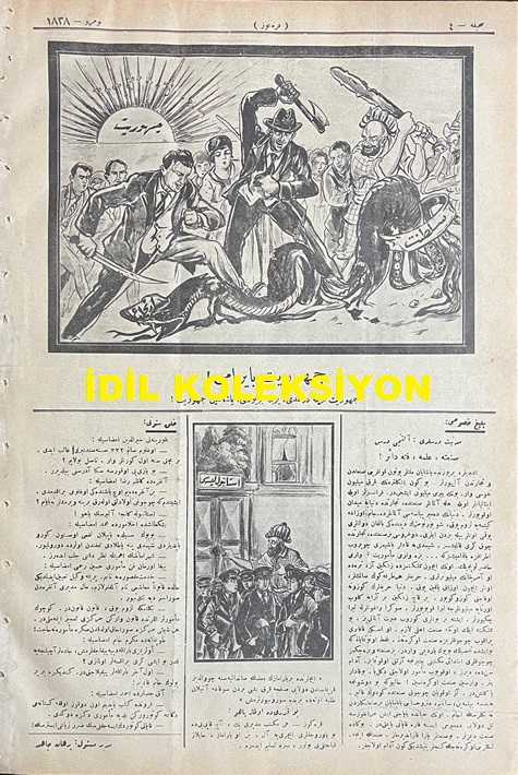 Osmanlıca Karagöz Mizah Dergisi-Gazetesi, Orijinal Dönem Basım, (Ottoman Magazine-Newspaper-Journal Illustré Cara-Gueuz) - 28 Ekim (Teşrin-i Evvel) 1925 - Sayı: 1838 - Hicri: 9 Rebiülahir 1344 - Karikatür: Gücü Gücü Yetene mi? "Pangalos: Ah Vire, Diyavlo, Vurazayim Bir Tekme, Gebertezeyim Bu Gospodini! Karagöz: Hey Barba Pangalo. Ona Tekme Vurmadan Evvel Arkana Bak. Hem Daha Sırtındaki Tekmenin İzi Bile Silinmemiş! - İrticaya Karşı Mücadele Temalı Cumhuriyet Bayramı'na Özel Karikatür: Cumhuriyet Bayramı! "Cumhuriyet Öyle Doğdu, Böyle Büyüdü: Yaşasın Cumhuriyet!" - Karikatür: "İçlerinde Bir Yaramazın Muallimin Sandalyesine Çuvaldız Koymasından Dolayı Sınıfça Kırk Beşi Birden Sokağa Atılan Talebe Ötede Beride Sürünüyorlarmış" Bu Kadarı da Olmaz Yahu! "Karagöz: Hey Mektep Müdürü Bey, Aç Kapıyı da Bu Yavrucakları İçeriye Al. Ben O Yaramaz, Haylaz Kabahatliyi Bulur, Size Teslim Ederim" adlı eser, Kitap > Süreli Yayınlar > Gazeteler > Türkiye > Genel kategorisinde İkinci El olarak satıştadır.