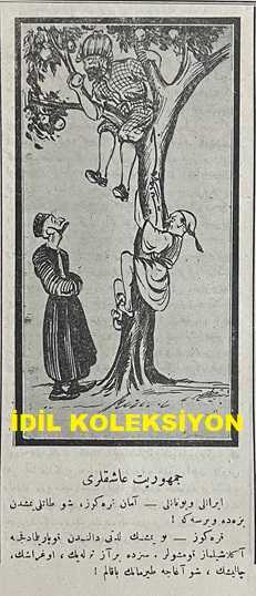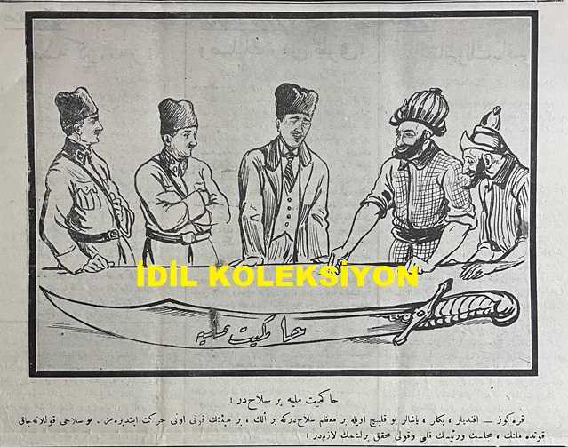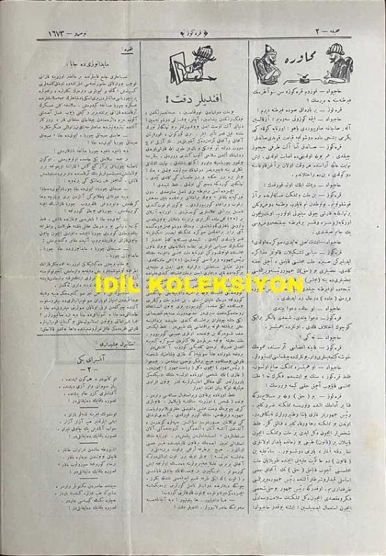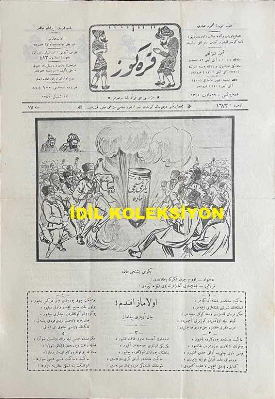 Osmanlıca Karagöz Mizah Dergisi-Gazetesi, Orijinal Dönem Basım, (Ottoman Magazine-Newspaper-Journal Illustré Cara-Gueuz) - 29 Mart 1924 - Sayı: 1673 - Hicri: 23 Şaban 1342 - Rumi: 29 Mart 1342 - Karikatür: Yirmi Beşinci Madde "Hacivat: Ohh Çok Şükür ki Patlamadı! Karagöz: Patlamadı Amma Fırkayı İkiye Ayırdı! - Atatürk ve İsmet İnönü'yü Tasvir Eden Karikatür: Hakimiyet-i Milliye Bir Silahtır! "Karagöz: Efendiler, Beyler, Paşalar Bu Kılıç Öyle Bir Muazzam Silahtır ki Bir Elin, Bir Heyetin Kuvveti Onu Hareket Ettiremez. Bu Silahı Kullanacak Kuvvette Milletin, Meclisin ve Reisin Kalbi ve Kavli Muhakkak Birleşmek Lazımdır!" - Karikatür: Cumhuriyet Aşıkları "İranlı ve Yunanlı: Aman Karagöz, Şu Tatlı Yemişten Bize de Versene! Karagöz: Bu Yemişin Lezzeti Dalından Koparılmadıkça Anlaşılamaz Komşular", Burhan Cahit (MORKAYA) tarafından kaleme alınmıştır. Kitap 1924 yılında Ali Fuat ve Şürekası Karagöz Gazetesi Şirketi tarafından [İstanbul] yayınlanmıştır. Satışta olan kitap, yayınevinin 1.673. baskısıdır. 4 sayfadır. Osmanlıca Karagöz Mizah Dergisi-Gazetesi, Orijinal Dönem Basım, (Ottoman Magazine-Newspaper-Journal Illustré Cara-Gueuz) - 29 Mart 1924 - Sayı: 1673 - Hicri: 23 Şaban 1342 - Rumi: 29 Mart 1342 - Karikatür: Yirmi Beşinci Madde "Hacivat: Ohh Çok Şükür ki Patlamadı! Karagöz: Patlamadı Amma Fırkayı İkiye Ayırdı! - Atatürk ve İsmet İnönü'yü Tasvir Eden Karikatür: Hakimiyet-i Milliye Bir Silahtır! "Karagöz: Efendiler, Beyler, Paşalar Bu Kılıç Öyle Bir Muazzam Silahtır ki Bir Elin, Bir Heyetin Kuvveti Onu Hareket Ettiremez. Bu Silahı Kullanacak Kuvvette Milletin, Meclisin ve Reisin Kalbi ve Kavli Muhakkak Birleşmek Lazımdır!" - Karikatür: Cumhuriyet Aşıkları "İranlı ve Yunanlı: Aman Karagöz, Şu Tatlı Yemişten Bize de Versene! Karagöz: Bu Yemişin Lezzeti Dalından Koparılmadıkça Anlaşılamaz Komşular" adlı eser Osmanlıca dilindedir.