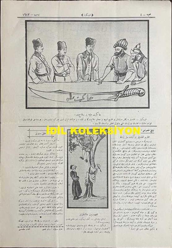 Osmanlıca Karagöz Mizah Dergisi-Gazetesi, Orijinal Dönem Basım, (Ottoman Magazine-Newspaper-Journal Illustré Cara-Gueuz) - 29 Mart 1924 - Sayı: 1673 - Hicri: 23 Şaban 1342 - Rumi: 29 Mart 1342 - Karikatür: Yirmi Beşinci Madde "Hacivat: Ohh Çok Şükür ki Patlamadı! Karagöz: Patlamadı Amma Fırkayı İkiye Ayırdı! - Atatürk ve İsmet İnönü'yü Tasvir Eden Karikatür: Hakimiyet-i Milliye Bir Silahtır! "Karagöz: Efendiler, Beyler, Paşalar Bu Kılıç Öyle Bir Muazzam Silahtır ki Bir Elin, Bir Heyetin Kuvveti Onu Hareket Ettiremez. Bu Silahı Kullanacak Kuvvette Milletin, Meclisin ve Reisin Kalbi ve Kavli Muhakkak Birleşmek Lazımdır!" - Karikatür: Cumhuriyet Aşıkları "İranlı ve Yunanlı: Aman Karagöz, Şu Tatlı Yemişten Bize de Versene! Karagöz: Bu Yemişin Lezzeti Dalından Koparılmadıkça Anlaşılamaz Komşular" adlı eser, Kitap > Süreli Yayınlar > Gazeteler > Türkiye > Genel kategorisinde İkinci El olarak satıştadır.