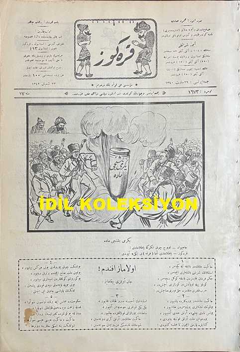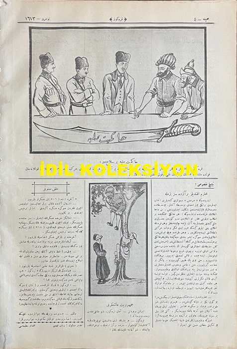 Osmanlıca Karagöz Mizah Dergisi-Gazetesi, Orijinal Dönem Basım, (Ottoman Magazine-Newspaper-Journal Illustré Cara-Gueuz) - 29 Mart 1924 - Sayı: 1673 - Hicri: 23 Şaban 1342 - Rumi: 29 Mart 1342 - Karikatür: Yirmi Beşinci Madde "Hacivat: Ohh Çok Şükür ki Patlamadı! Karagöz: Patlamadı Amma Fırkayı İkiye Ayırdı! - Atatürk ve İsmet İnönü'yü Tasvir Eden Karikatür: Hakimiyet-i Milliye Bir Silahtır! "Karagöz: Efendiler, Beyler, Paşalar Bu Kılıç Öyle Bir Muazzam Silahtır ki Bir Elin, Bir Heyetin Kuvveti Onu Hareket Ettiremez. Bu Silahı Kullanacak Kuvvette Milletin, Meclisin ve Reisin Kalbi ve Kavli Muhakkak Birleşmek Lazımdır!" - Karikatür: Cumhuriyet Aşıkları "İranlı ve Yunanlı: Aman Karagöz, Şu Tatlı Yemişten Bize de Versene! Karagöz: Bu Yemişin Lezzeti Dalından Koparılmadıkça Anlaşılamaz Komşular" adlı eser, Kitap > Süreli Yayınlar > Gazeteler > Türkiye > Genel kategorisinde İkinci El olarak satıştadır.