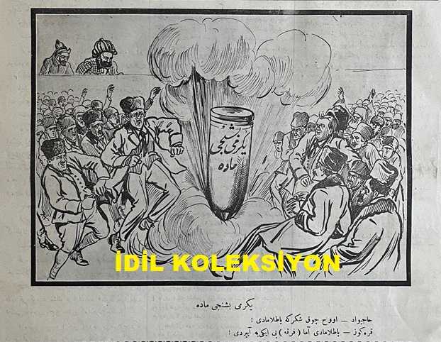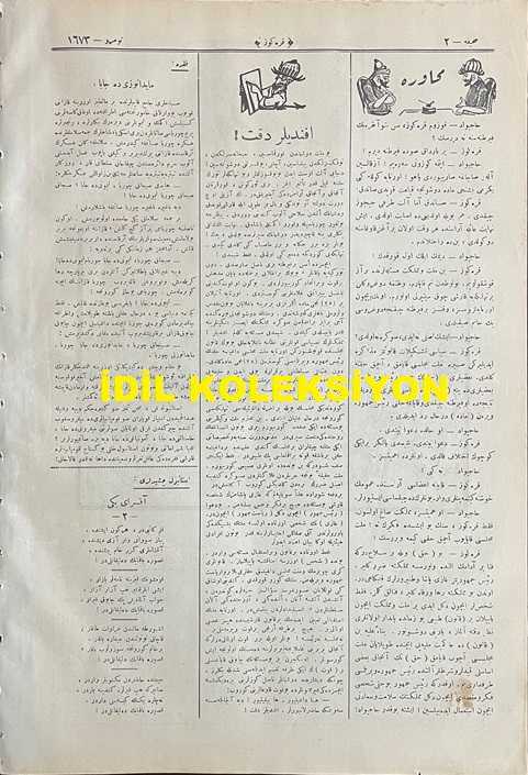 Osmanlıca Karagöz Mizah Dergisi-Gazetesi, Orijinal Dönem Basım, (Ottoman Magazine-Newspaper-Journal Illustré Cara-Gueuz) - 29 Mart 1924 - Sayı: 1673 - Hicri: 23 Şaban 1342 - Rumi: 29 Mart 1342 - Karikatür: Yirmi Beşinci Madde "Hacivat: Ohh Çok Şükür ki Patlamadı! Karagöz: Patlamadı Amma Fırkayı İkiye Ayırdı! - Atatürk ve İsmet İnönü'yü Tasvir Eden Karikatür: Hakimiyet-i Milliye Bir Silahtır! "Karagöz: Efendiler, Beyler, Paşalar Bu Kılıç Öyle Bir Muazzam Silahtır ki Bir Elin, Bir Heyetin Kuvveti Onu Hareket Ettiremez. Bu Silahı Kullanacak Kuvvette Milletin, Meclisin ve Reisin Kalbi ve Kavli Muhakkak Birleşmek Lazımdır!" - Karikatür: Cumhuriyet Aşıkları "İranlı ve Yunanlı: Aman Karagöz, Şu Tatlı Yemişten Bize de Versene! Karagöz: Bu Yemişin Lezzeti Dalından Koparılmadıkça Anlaşılamaz Komşular", Burhan Cahit (MORKAYA) tarafından kaleme alınmıştır. Kitap 1924 yılında Ali Fuat ve Şürekası Karagöz Gazetesi Şirketi tarafından [İstanbul] yayınlanmıştır. Satışta olan kitap, yayınevinin 1.673. baskısıdır. 4 sayfadır. Osmanlıca Karagöz Mizah Dergisi-Gazetesi, Orijinal Dönem Basım, (Ottoman Magazine-Newspaper-Journal Illustré Cara-Gueuz) - 29 Mart 1924 - Sayı: 1673 - Hicri: 23 Şaban 1342 - Rumi: 29 Mart 1342 - Karikatür: Yirmi Beşinci Madde "Hacivat: Ohh Çok Şükür ki Patlamadı! Karagöz: Patlamadı Amma Fırkayı İkiye Ayırdı! - Atatürk ve İsmet İnönü'yü Tasvir Eden Karikatür: Hakimiyet-i Milliye Bir Silahtır! "Karagöz: Efendiler, Beyler, Paşalar Bu Kılıç Öyle Bir Muazzam Silahtır ki Bir Elin, Bir Heyetin Kuvveti Onu Hareket Ettiremez. Bu Silahı Kullanacak Kuvvette Milletin, Meclisin ve Reisin Kalbi ve Kavli Muhakkak Birleşmek Lazımdır!" - Karikatür: Cumhuriyet Aşıkları "İranlı ve Yunanlı: Aman Karagöz, Şu Tatlı Yemişten Bize de Versene! Karagöz: Bu Yemişin Lezzeti Dalından Koparılmadıkça Anlaşılamaz Komşular" adlı eser Osmanlıca dilindedir.