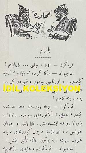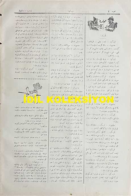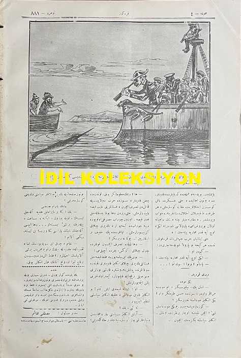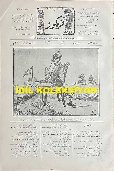 Osmanlıca Karagöz Mizah Dergisi-Gazetesi, Orijinal Dönem Basım, (Ottoman Magazine-Newspaper-Journal Illustré Cara-Gueuz) - 29 Temmuz 1916 - Sayı: 881 - Hicri: 28 Ramazan 1334 - Rumi: 16 Temmuz 1332 - Karikatür: "Karagöz: Şaşarım Aklınıza!.. Ulan Baksanıza Şöyle Böyle Çekiştirmekle Yerinden Kımıldayacak Şeye Benziyor mu?!..." - Muhavere: Bayram! - Hasbihal: Çalgı Çağanağın Tesiri - Rusya Kralı'nın Müstafi Hariciye Nazırı Sazanof'a Namesi - Karikatür: "Karagöz: Vay Korkak Herifler Vay! Adi Bir Balıktan Bu Kadar Telaşa Düşerseniz, Asıl Kendisini Görseniz Ne Halt Edeceksiniz?!..", Ali Fuat tarafından kaleme alınmıştır. Kitap 1916 yılında Ali Fuat ve Şürekası Karagöz Gazetesi Şirketi tarafından [İstanbul] yayınlanmıştır. Satışta olan kitap, yayınevinin 881. baskısıdır. 4 sayfadır. Osmanlıca Karagöz Mizah Dergisi-Gazetesi, Orijinal Dönem Basım, (Ottoman Magazine-Newspaper-Journal Illustré Cara-Gueuz) - 29 Temmuz 1916 - Sayı: 881 - Hicri: 28 Ramazan 1334 - Rumi: 16 Temmuz 1332 - Karikatür: "Karagöz: Şaşarım Aklınıza!.. Ulan Baksanıza Şöyle Böyle Çekiştirmekle Yerinden Kımıldayacak Şeye Benziyor mu?!..." - Muhavere: Bayram! - Hasbihal: Çalgı Çağanağın Tesiri - Rusya Kralı'nın Müstafi Hariciye Nazırı Sazanof'a Namesi - Karikatür: "Karagöz: Vay Korkak Herifler Vay! Adi Bir Balıktan Bu Kadar Telaşa Düşerseniz, Asıl Kendisini Görseniz Ne Halt Edeceksiniz?!.." adlı eser Osmanlıca dilindedir.