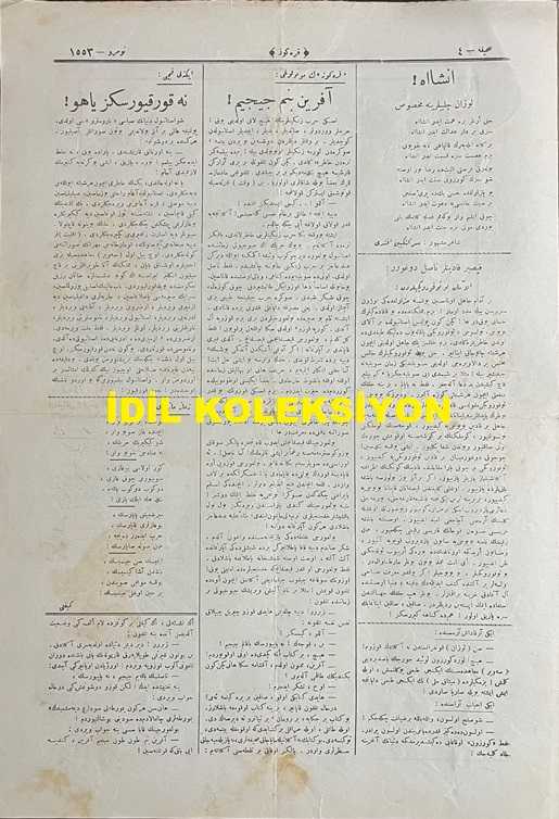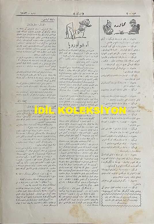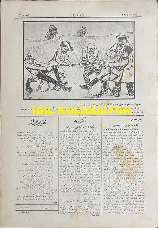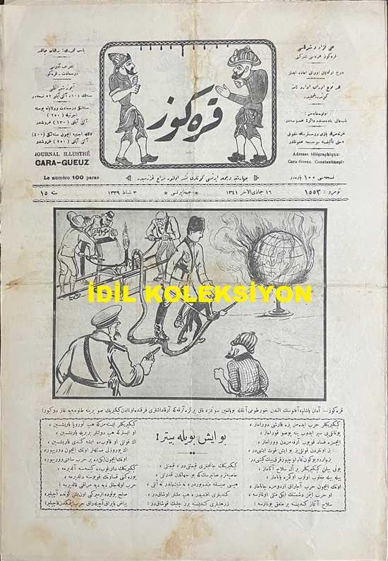 Osmanlıca Karagöz Mizah Dergisi-Gazetesi, Orijinal Dönem Basım, (Ottoman Magazine-Newspaper-Journal Illustré Cara-Gueuz) - 3 Şubat 1923 - Sayı: 1553 - Hicri: 16 Cemaziyelahir 1341 - Rumi: 3 Şubat 1339 - İsmet İnönü'yü Tasvir Eden Karikatür: "Karagöz: Aman Paşam, Aftosun Elinden Hortumu Almakla Bu Yangın Sönmez, Bak Bir Kere Arkana Arkadaşları Farkında Olmadan Kikirik Su Yerine Tulumbaya Gaz Döküyor!" - İsmet İnönü'yü Tasvir Eden Karikatür: "Hacivat: Kikirik Sıkı Asıldı Amma Hani Bir Koptu mu Sırtüstü Yerdedir ha! Karagöz: Ne Hinoğlu Hindir O! İp Koparsa Düşeceğini Biliyor da Tehlikeyi Görünce Hemen Ötekileri Araya Sokuyor! Merak Etme Bu İp Kopmadan Barışıklık Olacak!" - Ankara'ya Emektarlar Namına İkinci Bir Arzuhal: İstanbul Sıkıntı İçinde! Kapanan Nezaret Kapıları Binlerce Ailenin Elini Boş Bıraktı. Bugün Faal Memurun Bile Karnı Doymazken Memlekette Bir de Gayr-ı Faal Diye Eline Sadaka Nevinden Beş On Kuruş Tutuşturulan Düşkün ve Ümitsiz bir Sınıf Türedi..., Burhan Cahit (MORKAYA) tarafından kaleme alınmıştır. Kitap 1923 yılında Ali Fuat ve Şürekası Karagöz Gazetesi Şirketi tarafından [İstanbul] yayınlanmıştır. Satışta olan kitap, yayınevinin 1.553. baskısıdır. 4 sayfadır. Osmanlıca Karagöz Mizah Dergisi-Gazetesi, Orijinal Dönem Basım, (Ottoman Magazine-Newspaper-Journal Illustré Cara-Gueuz) - 3 Şubat 1923 - Sayı: 1553 - Hicri: 16 Cemaziyelahir 1341 - Rumi: 3 Şubat 1339 - İsmet İnönü'yü Tasvir Eden Karikatür: "Karagöz: Aman Paşam, Aftosun Elinden Hortumu Almakla Bu Yangın Sönmez, Bak Bir Kere Arkana Arkadaşları Farkında Olmadan Kikirik Su Yerine Tulumbaya Gaz Döküyor!" - İsmet İnönü'yü Tasvir Eden Karikatür: "Hacivat: Kikirik Sıkı Asıldı Amma Hani Bir Koptu mu Sırtüstü Yerdedir ha! Karagöz: Ne Hinoğlu Hindir O! İp Koparsa Düşeceğini Biliyor da Tehlikeyi Görünce Hemen Ötekileri Araya Sokuyor! Merak Etme Bu İp Kopmadan Barışıklık Olacak!" - Ankara'ya Emektarlar Namına İkinci Bir Arzuhal: İstanbul Sıkıntı İçinde! Kapanan Nezaret Kapıları Binlerce Ailenin Elini Boş Bıraktı. Bugün Faal Memurun Bile Karnı Doymazken Memlekette Bir de Gayr-ı Faal Diye Eline Sadaka Nevinden Beş On Kuruş Tutuşturulan Düşkün ve Ümitsiz bir Sınıf Türedi... adlı eser Osmanlıca dilindedir.
