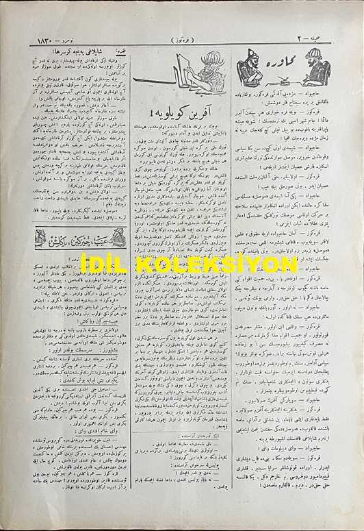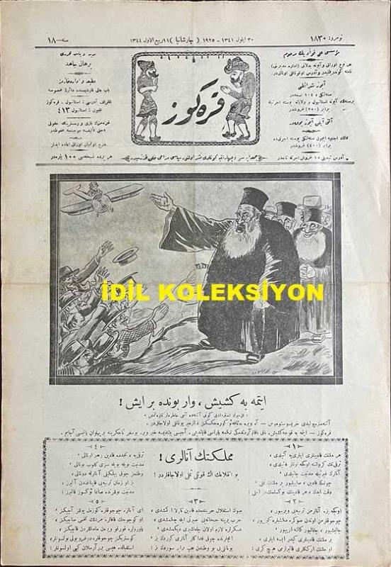 Osmanlıca Karagöz Mizah Dergisi-Gazetesi, Orijinal Dönem Basım, (Ottoman Magazine-Newspaper-Journal Illustré Cara-Gueuz) - 30 Eylül 1925 - Sayı: 1830 - Hicri: 11 Rebiülevvel 1344 - Rumi: 30 Eylül 1341 - Karikatür: Etme Be Keşiş, Var Bunda Bir İş! "İzmir'in İstirdadı Günü Atina'da Acı Hatıralar Tazelenmiş" "Atina Metropolidi: Ah Vire Matefeö Göreceksiniz, İzmir Yunanlı Olacaktır. Karagöz: Etme Be Koca Keşiş. Bak Bakalım Ardındaki Tekme Yarası Kapandı mı? Acısı Bittiyse Haber Ver. Bu Sefer Ta Ciğerine Bir Pehlivan Yakısı Açayım" - Karikatür: Siyasi Atlı Karınca Asker Çocuk, Yirmi Para, Başı Bozuk Kırk Para! "Hacivat: Aman Karagöz, Şunların Haline de Bak. Saçlı Sakallı Herifler, Çocuk Gibi Atlı Karınca Oynuyorlar. Karagöz: Buna Siyasi Atlı Karınca Derler. Kikirik Usta Tarafından Ara Sıra Cenevre'de Kurulur. Bu Sakallı Beyler de Cemiyet-i Akvam Azasıdır. Onları Biraz Eğlendirir, Hoplatır, Oynatır. Alem de Katıla Katıla Gülüp Seyreder", Burhan Cahit (MORKAYA) tarafından kaleme alınmıştır. Kitap 1925 yılında Ali Fuat ve Şürekası Karagöz Gazetesi Şirketi tarafından [İstanbul] yayınlanmıştır. Satışta olan kitap, yayınevinin 1.830. baskısıdır. 4 sayfadır. Osmanlıca Karagöz Mizah Dergisi-Gazetesi, Orijinal Dönem Basım, (Ottoman Magazine-Newspaper-Journal Illustré Cara-Gueuz) - 30 Eylül 1925 - Sayı: 1830 - Hicri: 11 Rebiülevvel 1344 - Rumi: 30 Eylül 1341 - Karikatür: Etme Be Keşiş, Var Bunda Bir İş! "İzmir'in İstirdadı Günü Atina'da Acı Hatıralar Tazelenmiş" "Atina Metropolidi: Ah Vire Matefeö Göreceksiniz, İzmir Yunanlı Olacaktır. Karagöz: Etme Be Koca Keşiş. Bak Bakalım Ardındaki Tekme Yarası Kapandı mı? Acısı Bittiyse Haber Ver. Bu Sefer Ta Ciğerine Bir Pehlivan Yakısı Açayım" - Karikatür: Siyasi Atlı Karınca Asker Çocuk, Yirmi Para, Başı Bozuk Kırk Para! "Hacivat: Aman Karagöz, Şunların Haline de Bak. Saçlı Sakallı Herifler, Çocuk Gibi Atlı Karınca Oynuyorlar. Karagöz: Buna Siyasi Atlı Karınca Derler. Kikirik Usta Tarafından Ara Sıra Cenevre'de Kurulur. Bu Sakallı Beyler de Cemiyet-i Akvam Azasıdır. Onları Biraz Eğlendirir, Hoplatır, Oynatır. Alem de Katıla Katıla Gülüp Seyreder" adlı eser Osmanlıca dilindedir.
