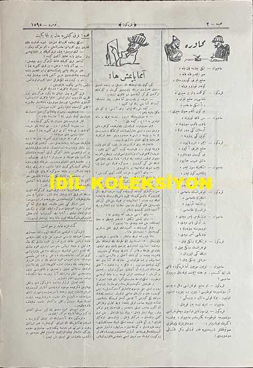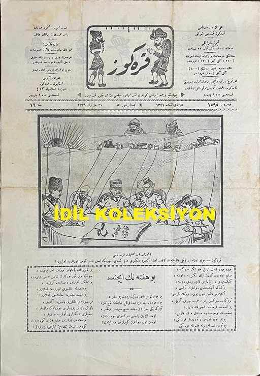 Osmanlıca Karagöz Mizah Dergisi-Gazetesi, Orijinal Dönem Basım, (Ottoman Magazine-Newspaper-Journal Illustré Cara-Gueuz) - 30 Haziran 1923 - Sayı: 1595 - Hicri: 15 Zilkade 1341 - Rumi: 30 Haziran 1339 - Lozan Barış Konferansı Temalı İsmet İnönü'yü Tasvir Eden Karikatür: Lozan'da Talimat Komedyası "Karagöz: Böyle Uzaklara Bağlı Kaldıkça O Kağıda İmza Atamayacağınızı Aklım Kesti. Çünkü Asıl Fiskos Buralarda Oluyor!" - İsmet İnönü'yü Tasvir Eden Karikatür: Karagöz: Haydi Paşam, Haydi Paşam, Bu Lafların Arkası Gelmeyecek! İyisi mi Atla Trene Bak Arkandan Nasıl Koşacaklar! Hele Bir Tanesi Şimdiden El Edip Çağırmaya Başladı! - Venizelos'u Tasvir Eden Karikatür: "Venizelos: Gözümden, Gönlümden Hayali Gitmez, Günler Geçer, Haber Gelir, Yar Gelmez...", Burhan Cahit (MORKAYA) tarafından kaleme alınmıştır. Kitap 1923 yılında Ali Fuat ve Şürekası Karagöz Gazetesi Şirketi tarafından [İstanbul] yayınlanmıştır. Satışta olan kitap, yayınevinin 1.595. baskısıdır. 4 sayfadır. Osmanlıca Karagöz Mizah Dergisi-Gazetesi, Orijinal Dönem Basım, (Ottoman Magazine-Newspaper-Journal Illustré Cara-Gueuz) - 30 Haziran 1923 - Sayı: 1595 - Hicri: 15 Zilkade 1341 - Rumi: 30 Haziran 1339 - Lozan Barış Konferansı Temalı İsmet İnönü'yü Tasvir Eden Karikatür: Lozan'da Talimat Komedyası "Karagöz: Böyle Uzaklara Bağlı Kaldıkça O Kağıda İmza Atamayacağınızı Aklım Kesti. Çünkü Asıl Fiskos Buralarda Oluyor!" - İsmet İnönü'yü Tasvir Eden Karikatür: Karagöz: Haydi Paşam, Haydi Paşam, Bu Lafların Arkası Gelmeyecek! İyisi mi Atla Trene Bak Arkandan Nasıl Koşacaklar! Hele Bir Tanesi Şimdiden El Edip Çağırmaya Başladı! - Venizelos'u Tasvir Eden Karikatür: "Venizelos: Gözümden, Gönlümden Hayali Gitmez, Günler Geçer, Haber Gelir, Yar Gelmez..." adlı eser Osmanlıca dilindedir.