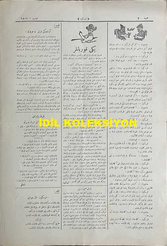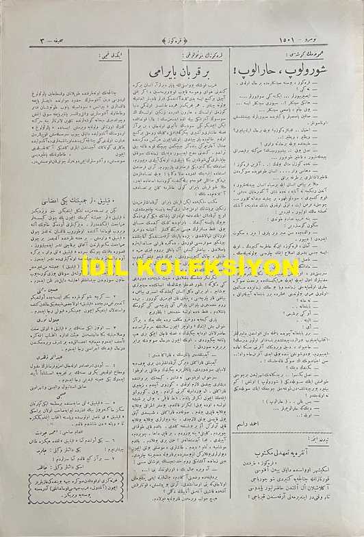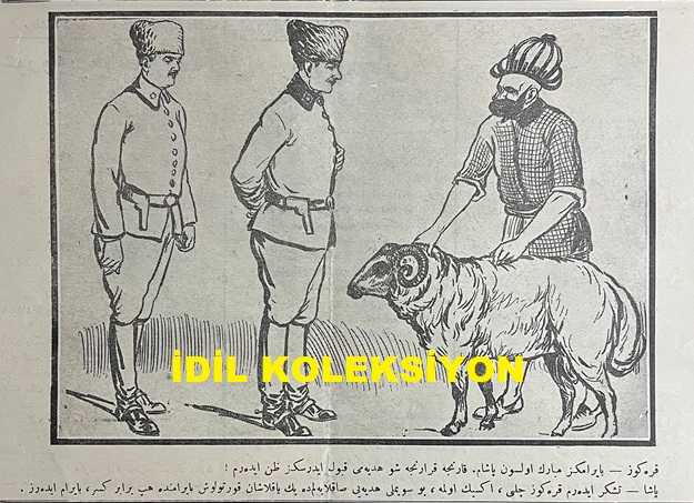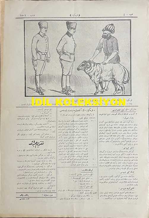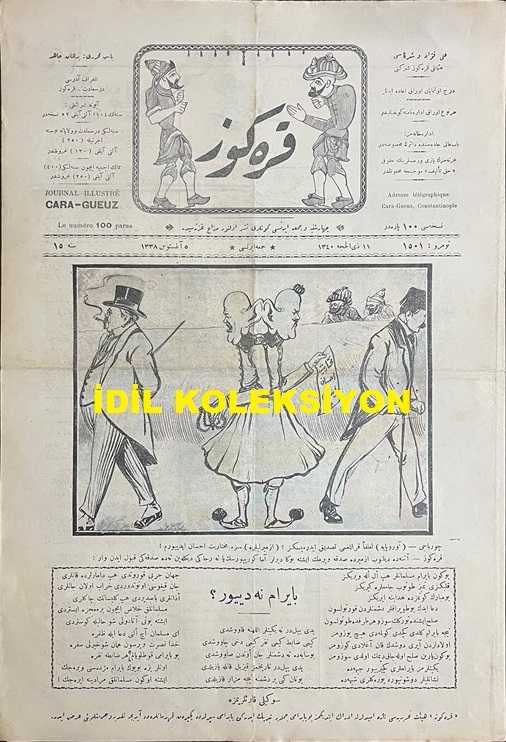 Osmanlıca Karagöz Mizah Dergisi-Gazetesi, Orijinal Dönem Basım, (Ottoman Magazine-Newspaper-Journal Illustré Cara-Gueuz) - 5 Ağustos 1922 - Sayı: 1501 - Hicri: 11 Zilhicce 1340 - Rumi: 5 Ağustos 1338 - Karikatür: Çorbacı: (Avrupa'ya) Lütfen Krallığımı Tasdik Eder misiniz? (İzmirlilere) Size Muhtariyet İhsan Ediyorum! Karagöz: Atina'da Dilenip İzmir'de Sadaka Vermek İşte Buna Derler Amma Görüyorsun Ya Ne Ricanı Dinleyen Ne de Sadakanı Kabul Eden Var!" - Amcamın Köşesi: "Şurulup, Haralup!" Ahmet Rasim - Atatürk'ü Tasvir Eden Karikatür: "Karagöz: Bayramınız Mübarek Olsun Paşam. Karınca Kararınca Şu Hediyemi Kabul Edersiniz Zannediyorum! Paşa: Teşekkür Ederim Karagöz Çelebi, Eksik Olma, Bu Sevimli Hediyeyi Saklayalım da Pek Yaklaşan Kurtuluş Bayramında Hep Beraber Keser, Bayram Ederiz", Burhan Cahit (MORKAYA) tarafından kaleme alınmıştır. Kitap 1922 yılında Ali Fuat ve Şürekası Karagöz Gazetesi Şirketi tarafından [İstanbul] yayınlanmıştır. Satışta olan kitap, yayınevinin 1.501. baskısıdır. 4 sayfadır. Osmanlıca Karagöz Mizah Dergisi-Gazetesi, Orijinal Dönem Basım, (Ottoman Magazine-Newspaper-Journal Illustré Cara-Gueuz) - 5 Ağustos 1922 - Sayı: 1501 - Hicri: 11 Zilhicce 1340 - Rumi: 5 Ağustos 1338 - Karikatür: Çorbacı: (Avrupa'ya) Lütfen Krallığımı Tasdik Eder misiniz? (İzmirlilere) Size Muhtariyet İhsan Ediyorum! Karagöz: Atina'da Dilenip İzmir'de Sadaka Vermek İşte Buna Derler Amma Görüyorsun Ya Ne Ricanı Dinleyen Ne de Sadakanı Kabul Eden Var!" - Amcamın Köşesi: "Şurulup, Haralup!" Ahmet Rasim - Atatürk'ü Tasvir Eden Karikatür: "Karagöz: Bayramınız Mübarek Olsun Paşam. Karınca Kararınca Şu Hediyemi Kabul Edersiniz Zannediyorum! Paşa: Teşekkür Ederim Karagöz Çelebi, Eksik Olma, Bu Sevimli Hediyeyi Saklayalım da Pek Yaklaşan Kurtuluş Bayramında Hep Beraber Keser, Bayram Ederiz" adlı eser Osmanlıca dilindedir.