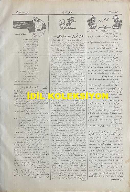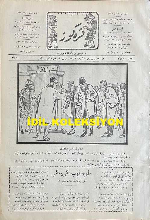 Osmanlıca Karagöz Mizah Dergisi-Gazetesi, Orijinal Dönem Basım, (Ottoman Magazine-Newspaper-Journal Illustré Cara-Gueuz) - 5 Nisan 1924 - Sayı: 1675 - Hicri: 30 Şaban 1342 - Rumi: 5 Nisan 1340 - Karikatür: İstanbul Valisi İyileşti "Cemiyet-i Belediye Azası: Buyurunuz Vali Beyefendimiz Buyurunuz Efendim, Allah Vücudunuza Sıhhat, Kesenize Servet, ve Cemiyet-i Acizanemize Olan Muhabbetinize Kuvvet İhsan Buyursun! Karagöz: Bana Sorarsan Vali Bey, Allah Aklına Kuvvet, Kalbine Merhamet ve Harekatına da Basiret İhsan Buyursun Derim. Çünkü Bu Gidişle İstanbullular Sana Teşekkür Ederlerken Bile Gözleri Dolacak!" - Karikatür: Rahmet mi, Merhamet mi? "Karagöz: Ey İstanbullular, Başka Memleketlerde Kuraklıktan Rahmet Duasına Çıkarlar. Biz Pahalılktan Merhamet Duasına Çıkarsak Ayıp mı? Haydi Hep Beraber El Açıp Tanrıya Yalvaralım: Ey Büyük Şehremini Senden Büyük Allah Var!", Burhan Cahit (MORKAYA) tarafından kaleme alınmıştır. Kitap 1924 yılında Ali Fuat ve Şürekası Karagöz Gazetesi Şirketi tarafından [İstanbul] yayınlanmıştır. Satışta olan kitap, yayınevinin 1.675. baskısıdır. 4 sayfadır. Osmanlıca Karagöz Mizah Dergisi-Gazetesi, Orijinal Dönem Basım, (Ottoman Magazine-Newspaper-Journal Illustré Cara-Gueuz) - 5 Nisan 1924 - Sayı: 1675 - Hicri: 30 Şaban 1342 - Rumi: 5 Nisan 1340 - Karikatür: İstanbul Valisi İyileşti "Cemiyet-i Belediye Azası: Buyurunuz Vali Beyefendimiz Buyurunuz Efendim, Allah Vücudunuza Sıhhat, Kesenize Servet, ve Cemiyet-i Acizanemize Olan Muhabbetinize Kuvvet İhsan Buyursun! Karagöz: Bana Sorarsan Vali Bey, Allah Aklına Kuvvet, Kalbine Merhamet ve Harekatına da Basiret İhsan Buyursun Derim. Çünkü Bu Gidişle İstanbullular Sana Teşekkür Ederlerken Bile Gözleri Dolacak!" - Karikatür: Rahmet mi, Merhamet mi? "Karagöz: Ey İstanbullular, Başka Memleketlerde Kuraklıktan Rahmet Duasına Çıkarlar. Biz Pahalılktan Merhamet Duasına Çıkarsak Ayıp mı? Haydi Hep Beraber El Açıp Tanrıya Yalvaralım: Ey Büyük Şehremini Senden Büyük Allah Var!" adlı eser Osmanlıca dilindedir.