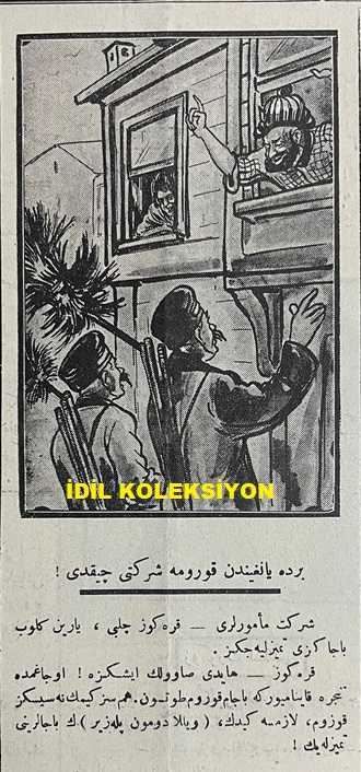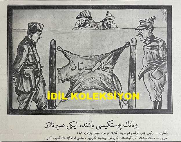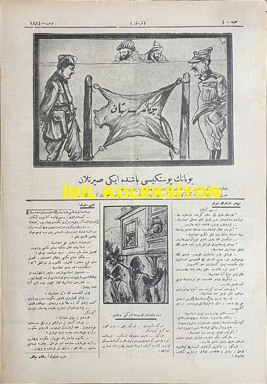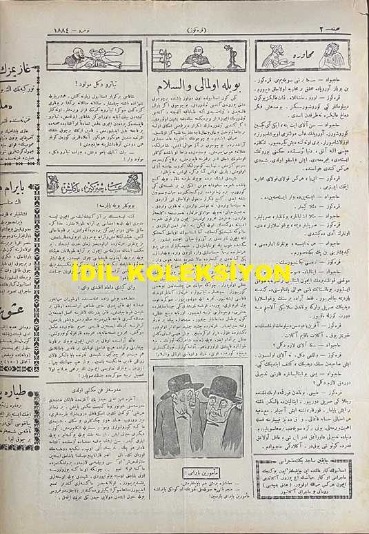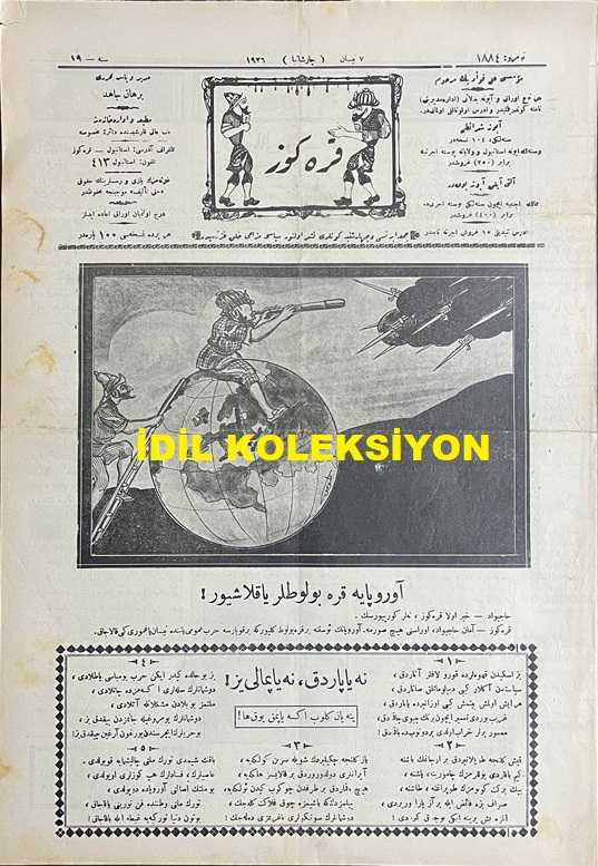 Osmanlıca Karagöz Mizah Dergisi-Gazetesi, Orijinal Dönem Basım, (Ottoman Magazine-Newspaper-Journal Illustré Cara-Gueuz) - 7 Nisan 1926 - Sayı: 1884 - Karikatürist Kozma Togo'nun Çalışması: Avrupa'ya Kara Bulutlar Yaklaşıyor! "Hacivat: Hayrola Karagöz, Neler Görüyorsun. Karagöz: Aman Hacivat, Orasını Hiç Sorma. Avrupa'nın Üstüne Bir Kara Bulut Geliyor ki Bir Koparsa Harb-i Umumi Yanında Nisan Yağmuru Gibi Kalacak" - Gazimizin Hatıratı Türkiye'nin En Büyük Gazetesi Olan Milliyet Gazetesi'nde Neşredilmeye Başladı - Karikatür: Yunanın Postu Başında İki Sırtlan "Pangalos: Reis-i Cumhur Olsam Şu Deriden Kendime Gocuk Çıkarabilir miyim Acaba? Sırplı: Delik Deşik Amma Bir Köşesinden Bana Potur Çıkacağa Benziyor, Sahibi Oyalanınca Hemen Kesip Almalı" - Karikatür: Bir de Yangından Koruma Şirketi Çıktı, Burhan Cahit (MORKAYA) tarafından kaleme alınmıştır. Kitap 1926 yılında Ali Fuat ve Şürekası Karagöz Gazetesi Şirketi tarafından [İstanbul] yayınlanmıştır. Satışta olan kitap, yayınevinin 1.884. baskısıdır. 4 sayfadır. Osmanlıca Karagöz Mizah Dergisi-Gazetesi, Orijinal Dönem Basım, (Ottoman Magazine-Newspaper-Journal Illustré Cara-Gueuz) - 7 Nisan 1926 - Sayı: 1884 - Karikatürist Kozma Togo'nun Çalışması: Avrupa'ya Kara Bulutlar Yaklaşıyor! "Hacivat: Hayrola Karagöz, Neler Görüyorsun. Karagöz: Aman Hacivat, Orasını Hiç Sorma. Avrupa'nın Üstüne Bir Kara Bulut Geliyor ki Bir Koparsa Harb-i Umumi Yanında Nisan Yağmuru Gibi Kalacak" - Gazimizin Hatıratı Türkiye'nin En Büyük Gazetesi Olan Milliyet Gazetesi'nde Neşredilmeye Başladı - Karikatür: Yunanın Postu Başında İki Sırtlan "Pangalos: Reis-i Cumhur Olsam Şu Deriden Kendime Gocuk Çıkarabilir miyim Acaba? Sırplı: Delik Deşik Amma Bir Köşesinden Bana Potur Çıkacağa Benziyor, Sahibi Oyalanınca Hemen Kesip Almalı" - Karikatür: Bir de Yangından Koruma Şirketi Çıktı adlı eser Osmanlıca dilindedir.