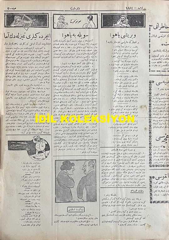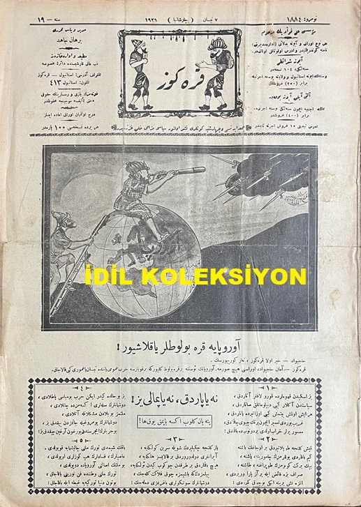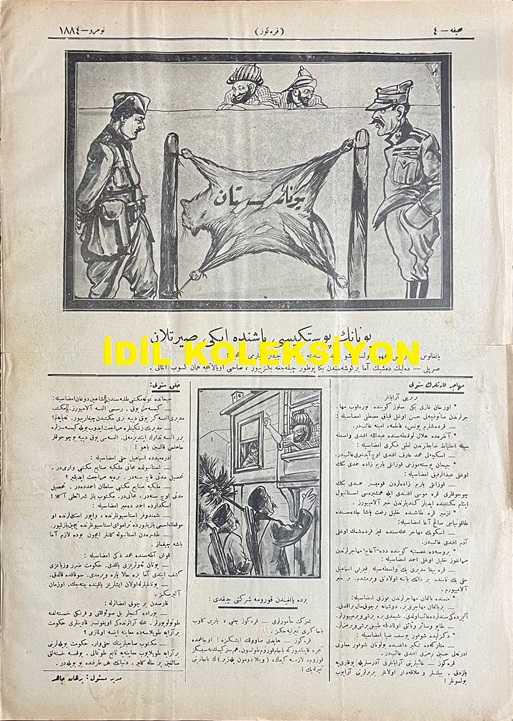 Osmanlıca Karagöz Mizah Dergisi-Gazetesi, Orijinal Dönem Basım, (Ottoman Magazine-Newspaper-Journal Illustré Cara-Gueuz) - 7 Nisan 1926 - Sayı: 1884 - Karikatürist Kozma Togo'nun Çalışması: Avrupa'ya Kara Bulutlar Yaklaşıyor! "Hacivat: Hayrola Karagöz, Neler Görüyorsun. Karagöz: Aman Hacivat, Orasını Hiç Sorma. Avrupa'nın Üstüne Bir Kara Bulut Geliyor ki Bir Koparsa Harb-i Umumi Yanında Nisan Yağmuru Gibi Kalacak" - Gazimizin Hatıratı Türkiye'nin En Büyük Gazetesi Olan Milliyet Gazetesi'nde Neşredilmeye Başladı - Karikatür: Yunanın Postu Başında İki Sırtlan "Pangalos: Reis-i Cumhur Olsam Şu Deriden Kendime Gocuk Çıkarabilir miyim Acaba? Sırplı: Delik Deşik Amma Bir Köşesinden Bana Potur Çıkacağa Benziyor, Sahibi Oyalanınca Hemen Kesip Almalı" - Karikatür: Bir de Yangından Koruma Şirketi Çıktı