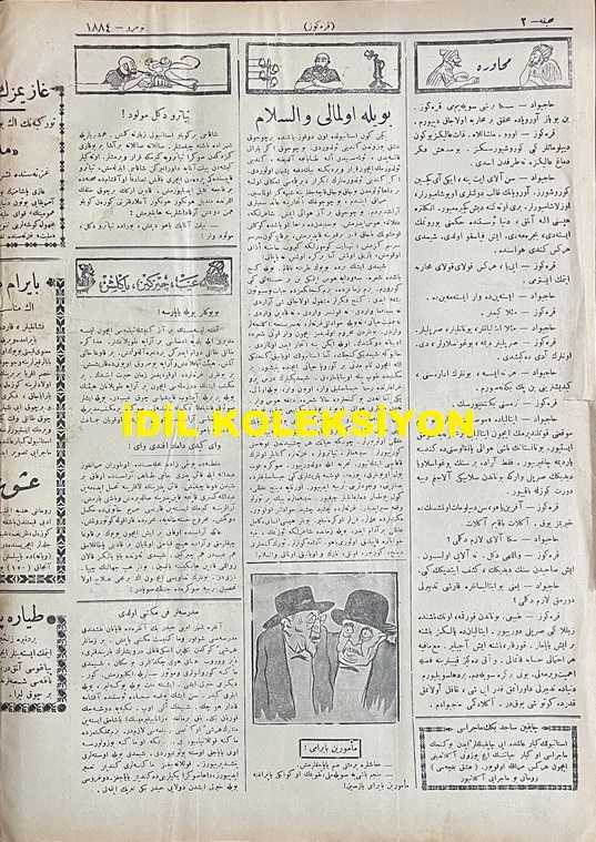 Osmanlıca Karagöz Mizah Dergisi-Gazetesi, Orijinal Dönem Basım, (Ottoman Magazine-Newspaper-Journal Illustré Cara-Gueuz) - 7 Nisan 1926 - Sayı: 1884 - Karikatürist Kozma Togo'nun Çalışması: Avrupa'ya Kara Bulutlar Yaklaşıyor! "Hacivat: Hayrola Karagöz, Neler Görüyorsun. Karagöz: Aman Hacivat, Orasını Hiç Sorma. Avrupa'nın Üstüne Bir Kara Bulut Geliyor ki Bir Koparsa Harb-i Umumi Yanında Nisan Yağmuru Gibi Kalacak" - Gazimizin Hatıratı Türkiye'nin En Büyük Gazetesi Olan Milliyet Gazetesi'nde Neşredilmeye Başladı - Karikatür: Yunanın Postu Başında İki Sırtlan "Pangalos: Reis-i Cumhur Olsam Şu Deriden Kendime Gocuk Çıkarabilir miyim Acaba? Sırplı: Delik Deşik Amma Bir Köşesinden Bana Potur Çıkacağa Benziyor, Sahibi Oyalanınca Hemen Kesip Almalı" - Karikatür: Bir de Yangından Koruma Şirketi Çıktı adlı eser, Kitap > Süreli Yayınlar > Gazeteler > Türkiye > Genel kategorisinde İkinci El olarak satıştadır.