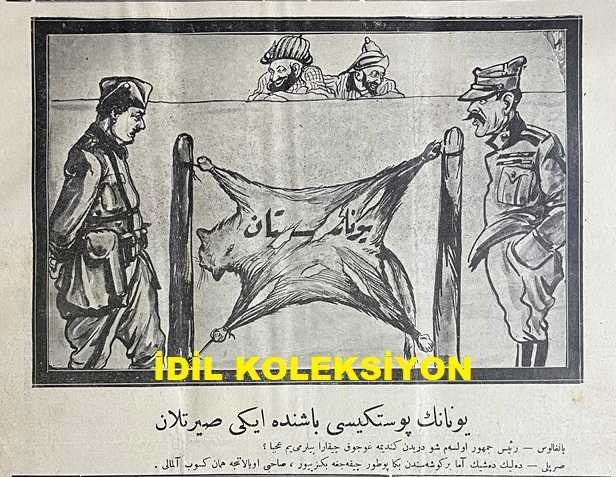 Osmanlıca Karagöz Mizah Dergisi-Gazetesi, Orijinal Dönem Basım, (Ottoman Magazine-Newspaper-Journal Illustré Cara-Gueuz) - 7 Nisan 1926 - Sayı: 1884 - Karikatürist Kozma Togo'nun Çalışması: Avrupa'ya Kara Bulutlar Yaklaşıyor! "Hacivat: Hayrola Karagöz, Neler Görüyorsun. Karagöz: Aman Hacivat, Orasını Hiç Sorma. Avrupa'nın Üstüne Bir Kara Bulut Geliyor ki Bir Koparsa Harb-i Umumi Yanında Nisan Yağmuru Gibi Kalacak" - Gazimizin Hatıratı Türkiye'nin En Büyük Gazetesi Olan Milliyet Gazetesi'nde Neşredilmeye Başladı - Karikatür: Yunanın Postu Başında İki Sırtlan "Pangalos: Reis-i Cumhur Olsam Şu Deriden Kendime Gocuk Çıkarabilir miyim Acaba? Sırplı: Delik Deşik Amma Bir Köşesinden Bana Potur Çıkacağa Benziyor, Sahibi Oyalanınca Hemen Kesip Almalı" - Karikatür: Bir de Yangından Koruma Şirketi Çıktı, Burhan Cahit (MORKAYA) tarafından kaleme alınmıştır. Kitap 1926 yılında Ali Fuat ve Şürekası Karagöz Gazetesi Şirketi tarafından [İstanbul] yayınlanmıştır. Satışta olan kitap, yayınevinin 1.884. baskısıdır. 4 sayfadır. Osmanlıca Karagöz Mizah Dergisi-Gazetesi, Orijinal Dönem Basım, (Ottoman Magazine-Newspaper-Journal Illustré Cara-Gueuz) - 7 Nisan 1926 - Sayı: 1884 - Karikatürist Kozma Togo'nun Çalışması: Avrupa'ya Kara Bulutlar Yaklaşıyor! "Hacivat: Hayrola Karagöz, Neler Görüyorsun. Karagöz: Aman Hacivat, Orasını Hiç Sorma. Avrupa'nın Üstüne Bir Kara Bulut Geliyor ki Bir Koparsa Harb-i Umumi Yanında Nisan Yağmuru Gibi Kalacak" - Gazimizin Hatıratı Türkiye'nin En Büyük Gazetesi Olan Milliyet Gazetesi'nde Neşredilmeye Başladı - Karikatür: Yunanın Postu Başında İki Sırtlan "Pangalos: Reis-i Cumhur Olsam Şu Deriden Kendime Gocuk Çıkarabilir miyim Acaba? Sırplı: Delik Deşik Amma Bir Köşesinden Bana Potur Çıkacağa Benziyor, Sahibi Oyalanınca Hemen Kesip Almalı" - Karikatür: Bir de Yangından Koruma Şirketi Çıktı adlı eser Osmanlıca dilindedir.