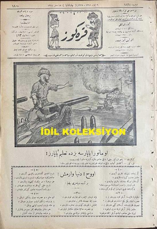 Osmanlıca Karagöz Mizah Dergisi-Gazetesi, Orijinal Dönem Basım, (Ottoman Magazine-Newspaper-Journal Illustré Cara-Gueuz) - 9 Eylül 1925 - Sayı: 1824 - Hicri: 15 Safer 1344 - Rumi: 9 Eylül 1341 - Karikatür: O Manevra Yaparsa Biz de Talim Yaparız! "Kikirik Bey: Yahu Karagöz Çelebi, Benimki Sahi Değil, Gemilerime Manevra Yaptırıyorum. Karagöz: Anladık A Canım, Benimki de Öyle, Topçularıma Talim Yaptırıyorum Ne Korkuyorsun!" - Dünya Varmış! Biraz da Dünyamızı Bilelim! "Az Zamanda Terakkinin Temelleri Atıldı, Milletimiz Medeniyet Kervanına Katıldı (...)" - "200 Bin Sarıklı 200 Tekke!" Şimdi Meydana Çıktı. Meğer İstanbul'da İki Yüz Bin Kadar Sarıklı ve İki Yüzden Fazla Tekke Varmış - Karikatür: Yine Bezirganlara Gün Doğdu! "Bezirgan: Eskiler Alıyorum, Fes Alıyorum, Şalvar, Cübbe, Sarık Alıyorum" adlı eser, Kitap > Süreli Yayınlar > Gazeteler > Türkiye > Genel kategorisinde İkinci El olarak satıştadır.
