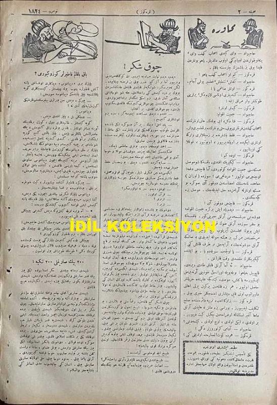 Osmanlıca Karagöz Mizah Dergisi-Gazetesi, Orijinal Dönem Basım, (Ottoman Magazine-Newspaper-Journal Illustré Cara-Gueuz) - 9 Eylül 1925 - Sayı: 1824 - Hicri: 15 Safer 1344 - Rumi: 9 Eylül 1341 - Karikatür: O Manevra Yaparsa Biz de Talim Yaparız! "Kikirik Bey: Yahu Karagöz Çelebi, Benimki Sahi Değil, Gemilerime Manevra Yaptırıyorum. Karagöz: Anladık A Canım, Benimki de Öyle, Topçularıma Talim Yaptırıyorum Ne Korkuyorsun!" - Dünya Varmış! Biraz da Dünyamızı Bilelim! "Az Zamanda Terakkinin Temelleri Atıldı, Milletimiz Medeniyet Kervanına Katıldı (...)" - "200 Bin Sarıklı 200 Tekke!" Şimdi Meydana Çıktı. Meğer İstanbul'da İki Yüz Bin Kadar Sarıklı ve İki Yüzden Fazla Tekke Varmış - Karikatür: Yine Bezirganlara Gün Doğdu! "Bezirgan: Eskiler Alıyorum, Fes Alıyorum, Şalvar, Cübbe, Sarık Alıyorum", Burhan Cahit (MORKAYA) tarafından kaleme alınmıştır. Kitap 1925 yılında Ali Fuat ve Şürekası Karagöz Gazetesi Şirketi tarafından [İstanbul] yayınlanmıştır. Satışta olan kitap, yayınevinin 1.824. baskısıdır. 4 sayfadır. Osmanlıca Karagöz Mizah Dergisi-Gazetesi, Orijinal Dönem Basım, (Ottoman Magazine-Newspaper-Journal Illustré Cara-Gueuz) - 9 Eylül 1925 - Sayı: 1824 - Hicri: 15 Safer 1344 - Rumi: 9 Eylül 1341 - Karikatür: O Manevra Yaparsa Biz de Talim Yaparız! "Kikirik Bey: Yahu Karagöz Çelebi, Benimki Sahi Değil, Gemilerime Manevra Yaptırıyorum. Karagöz: Anladık A Canım, Benimki de Öyle, Topçularıma Talim Yaptırıyorum Ne Korkuyorsun!" - Dünya Varmış! Biraz da Dünyamızı Bilelim! "Az Zamanda Terakkinin Temelleri Atıldı, Milletimiz Medeniyet Kervanına Katıldı (...)" - "200 Bin Sarıklı 200 Tekke!" Şimdi Meydana Çıktı. Meğer İstanbul'da İki Yüz Bin Kadar Sarıklı ve İki Yüzden Fazla Tekke Varmış - Karikatür: Yine Bezirganlara Gün Doğdu! "Bezirgan: Eskiler Alıyorum, Fes Alıyorum, Şalvar, Cübbe, Sarık Alıyorum" adlı eser Osmanlıca dilindedir.