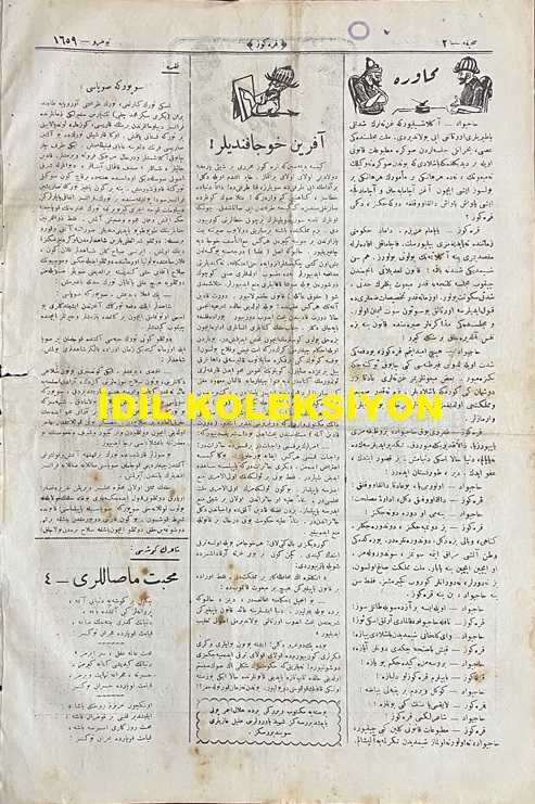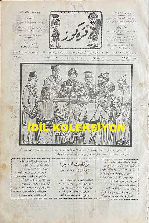 Osmanlıca Karagöz Mizah Dergisi-Gazetesi, Orijinal Dönem Basım, (Ottoman Magazine-Newspaper-Journal Illustré Cara-Gueuz) - 9 Şubat 1924 - Sayı: 1659 - Hicri: 3 Recep 1342 - Rumi: 9 Şubat 1340 - Karikatür: "Karagöz: Gel Hacivat Gel, Paşamızın Buyurduğu Gibi Uğruna Kan Döktüğümüz Cumhuriyete Hepimiz Demirden Bir Çember Kuralım! Cumhuriyet, Önünde Kanun Adalet, Elinde Seyf-i Celadet ve Etrafında Bu Sevgili Millet Oldukça Ebediyen Payidar Olacaktır" - Karikatür: Ankara'da Hariciye Memur Namzetleri "Ah Monşer, Şu Ankara'nın Kahrından Ne Zaman Kurtulup Avrupa'ya Kapağı Atacağız Bilmem ki! Karagöz: Pardon Azizim Monşer Beyim! Vatan Toprağını Hor Görenleri Biz Hakkımızı Müdafaa İçin Frengistan'a Gönderemeyiz. Hele Şurada Biraz Daha Ayran İçin de Monşerliğiniz Hafiflesin Bakalım!" - Tayyare ile İstanbul'dan Ankara'ya: İstanbul'dan Ankara'ya Bugün İlk Defa Hareket Edecek Olan Tecrübe Tayyaresiyle Ressamlarımızdan Ratip Tahir Bey de Ankara'ya Gidecektir., Burhan Cahit (MORKAYA) tarafından kaleme alınmıştır. Kitap 1924 yılında Ali Fuat ve Şürekası Karagöz Gazetesi Şirketi tarafından [İstanbul] yayınlanmıştır. Satışta olan kitap, yayınevinin 1.659. baskısıdır. 4 sayfadır. Osmanlıca Karagöz Mizah Dergisi-Gazetesi, Orijinal Dönem Basım, (Ottoman Magazine-Newspaper-Journal Illustré Cara-Gueuz) - 9 Şubat 1924 - Sayı: 1659 - Hicri: 3 Recep 1342 - Rumi: 9 Şubat 1340 - Karikatür: "Karagöz: Gel Hacivat Gel, Paşamızın Buyurduğu Gibi Uğruna Kan Döktüğümüz Cumhuriyete Hepimiz Demirden Bir Çember Kuralım! Cumhuriyet, Önünde Kanun Adalet, Elinde Seyf-i Celadet ve Etrafında Bu Sevgili Millet Oldukça Ebediyen Payidar Olacaktır" - Karikatür: Ankara'da Hariciye Memur Namzetleri "Ah Monşer, Şu Ankara'nın Kahrından Ne Zaman Kurtulup Avrupa'ya Kapağı Atacağız Bilmem ki! Karagöz: Pardon Azizim Monşer Beyim! Vatan Toprağını Hor Görenleri Biz Hakkımızı Müdafaa İçin Frengistan'a Gönderemeyiz. Hele Şurada Biraz Daha Ayran İçin de Monşerliğiniz Hafiflesin Bakalım!" - Tayyare ile İstanbul'dan Ankara'ya: İstanbul'dan Ankara'ya Bugün İlk Defa Hareket Edecek Olan Tecrübe Tayyaresiyle Ressamlarımızdan Ratip Tahir Bey de Ankara'ya Gidecektir. adlı eser Osmanlıca dilindedir.