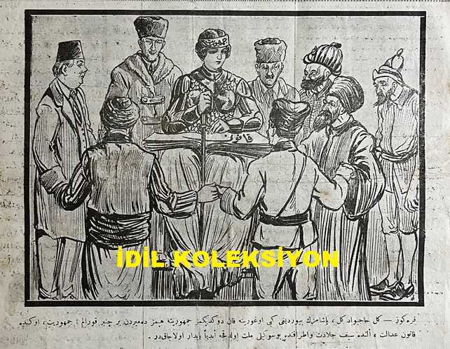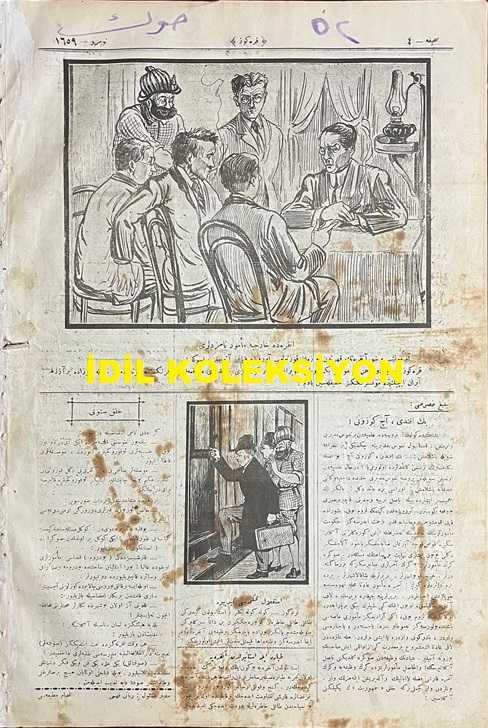 Osmanlıca Karagöz Mizah Dergisi-Gazetesi, Orijinal Dönem Basım, (Ottoman Magazine-Newspaper-Journal Illustré Cara-Gueuz) - 9 Şubat 1924 - Sayı: 1659 - Hicri: 3 Recep 1342 - Rumi: 9 Şubat 1340 - Karikatür: "Karagöz: Gel Hacivat Gel, Paşamızın Buyurduğu Gibi Uğruna Kan Döktüğümüz Cumhuriyete Hepimiz Demirden Bir Çember Kuralım! Cumhuriyet, Önünde Kanun Adalet, Elinde Seyf-i Celadet ve Etrafında Bu Sevgili Millet Oldukça Ebediyen Payidar Olacaktır" - Karikatür: Ankara'da Hariciye Memur Namzetleri "Ah Monşer, Şu Ankara'nın Kahrından Ne Zaman Kurtulup Avrupa'ya Kapağı Atacağız Bilmem ki! Karagöz: Pardon Azizim Monşer Beyim! Vatan Toprağını Hor Görenleri Biz Hakkımızı Müdafaa İçin Frengistan'a Gönderemeyiz. Hele Şurada Biraz Daha Ayran İçin de Monşerliğiniz Hafiflesin Bakalım!" - Tayyare ile İstanbul'dan Ankara'ya: İstanbul'dan Ankara'ya Bugün İlk Defa Hareket Edecek Olan Tecrübe Tayyaresiyle Ressamlarımızdan Ratip Tahir Bey de Ankara'ya Gidecektir. adlı eser, Kitap > Süreli Yayınlar > Gazeteler > Türkiye > Genel kategorisinde İkinci El olarak satıştadır.