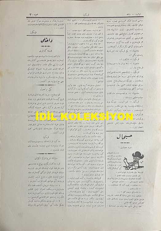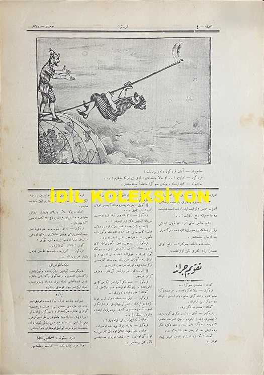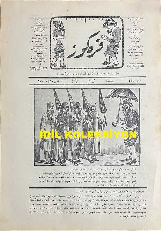 Osmanlıca Karagöz Mizah Dergisi-Gazetesi, Orijinal Dönem Basım, (Ottoman Magazine-Newspaper-Journal Illustré Kara-Gueuz) - 1 Ekim 1913 - Sayı: 561 - Hicri: 29 Şevval 1331 - Rumi: 18 Eylül 1329 - Karikatürist Ali Fuat Bey'in Çalışması: "Karagöz: Bir, İki, Üç.. Şemsiyeler Yukarı.... Aç!... Marş Marş!.. Hazırundan Biri: Canım Karagöz, Ne Yapıyorsun Her Şey Bitti de Bize Asker Oyunu mu Oynatıyorsun! Karagöz: Hayır, Şemsiye Talimi Yaptırıyodum. Artık Yağmurlar Başladı. Bizim Bir Sınıf Halk Vardır ki Bir Türlü Sokakta Şemsiye ile Yürümesini Öğrenemedi. Bazısı Şemsiyeyle Diğerinin Gözünü Oyar, Bazısı da Sularını Başkasının Ensesine Akıtır, Bundan Başka Bir Çare-i Halas Bulamadım" - Muhavere: Bulgaristan'la Akd-i Sulh Münasebetiyle - Karikatürist Ali Fuat Bey'in Çalışması: "Hacivat: Aman Karagöz, Ne Yapıyorsun? Karagöz: Ne Yapayım?.. O Hala Çıkamadı, Bari Ben Ona Çıkayım!... Hacivat: Acele Ettin. Bundan Sonra Muntazaman Çıkacaktır" adlı eser, Kitap > Süreli Yayınlar > Gazeteler > Türkiye > Genel kategorisinde İkinci El olarak satıştadır.