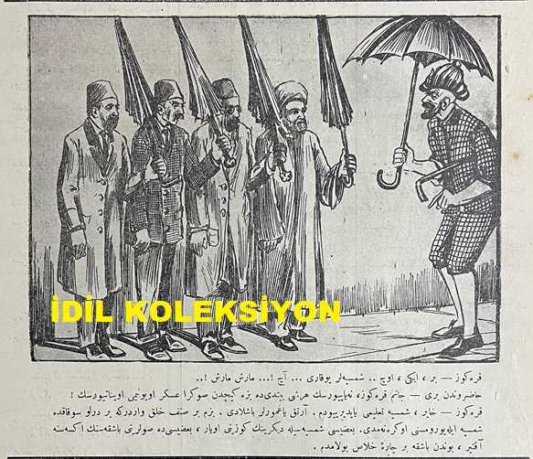 Osmanlıca Karagöz Mizah Dergisi-Gazetesi, Orijinal Dönem Basım, (Ottoman Magazine-Newspaper-Journal Illustré Kara-Gueuz) - 1 Ekim 1913 - Sayı: 561 - Hicri: 29 Şevval 1331 - Rumi: 18 Eylül 1329 - Karikatürist Ali Fuat Bey'in Çalışması: "Karagöz: Bir, İki, Üç.. Şemsiyeler Yukarı.... Aç!... Marş Marş!.. Hazırundan Biri: Canım Karagöz, Ne Yapıyorsun Her Şey Bitti de Bize Asker Oyunu mu Oynatıyorsun! Karagöz: Hayır, Şemsiye Talimi Yaptırıyodum. Artık Yağmurlar Başladı. Bizim Bir Sınıf Halk Vardır ki Bir Türlü Sokakta Şemsiye ile Yürümesini Öğrenemedi. Bazısı Şemsiyeyle Diğerinin Gözünü Oyar, Bazısı da Sularını Başkasının Ensesine Akıtır, Bundan Başka Bir Çare-i Halas Bulamadım" - Muhavere: Bulgaristan'la Akd-i Sulh Münasebetiyle - Karikatürist Ali Fuat Bey'in Çalışması: "Hacivat: Aman Karagöz, Ne Yapıyorsun? Karagöz: Ne Yapayım?.. O Hala Çıkamadı, Bari Ben Ona Çıkayım!... Hacivat: Acele Ettin. Bundan Sonra Muntazaman Çıkacaktır", Baha Tevfik tarafından kaleme alınmıştır. Kitap 1913 yılında Sahib-i İmtiyaz ve Musavviri: Ali Fuat tarafından [İstanbul] yayınlanmıştır. Satışta olan kitap, yayınevinin 561. baskısıdır. 4 sayfadır. Osmanlıca Karagöz Mizah Dergisi-Gazetesi, Orijinal Dönem Basım, (Ottoman Magazine-Newspaper-Journal Illustré Kara-Gueuz) - 1 Ekim 1913 - Sayı: 561 - Hicri: 29 Şevval 1331 - Rumi: 18 Eylül 1329 - Karikatürist Ali Fuat Bey'in Çalışması: "Karagöz: Bir, İki, Üç.. Şemsiyeler Yukarı.... Aç!... Marş Marş!.. Hazırundan Biri: Canım Karagöz, Ne Yapıyorsun Her Şey Bitti de Bize Asker Oyunu mu Oynatıyorsun! Karagöz: Hayır, Şemsiye Talimi Yaptırıyodum. Artık Yağmurlar Başladı. Bizim Bir Sınıf Halk Vardır ki Bir Türlü Sokakta Şemsiye ile Yürümesini Öğrenemedi. Bazısı Şemsiyeyle Diğerinin Gözünü Oyar, Bazısı da Sularını Başkasının Ensesine Akıtır, Bundan Başka Bir Çare-i Halas Bulamadım" - Muhavere: Bulgaristan'la Akd-i Sulh Münasebetiyle - Karikatürist Ali Fuat Bey'in Çalışması: "Hacivat: Aman Karagöz, Ne Yapıyorsun? Karagöz: Ne Yapayım?.. O Hala Çıkamadı, Bari Ben Ona Çıkayım!... Hacivat: Acele Ettin. Bundan Sonra Muntazaman Çıkacaktır" adlı eser Osmanlıca dilindedir.