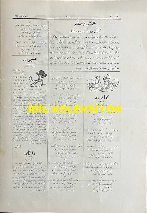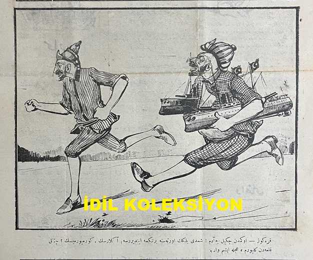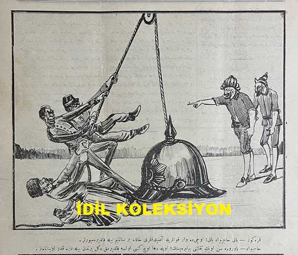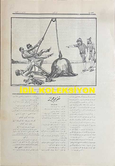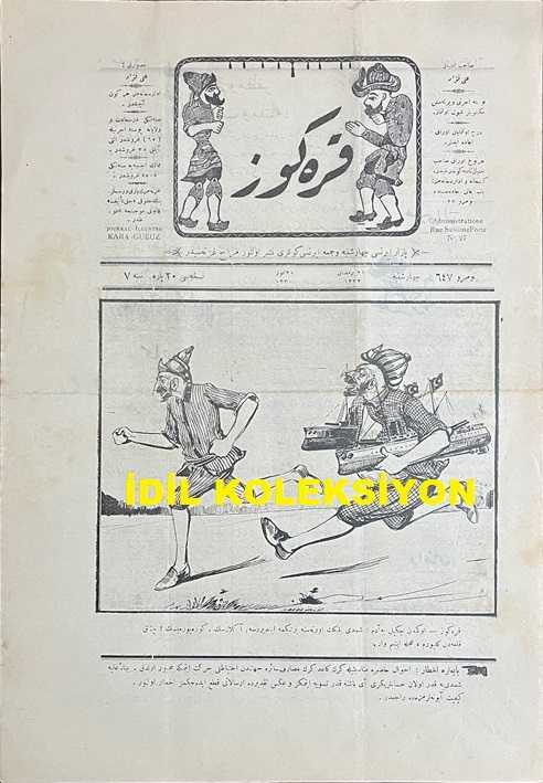 Osmanlıca Karagöz Mizah Dergisi-Gazetesi, Orijinal Dönem Basım, (Ottoman Magazine-Newspaper-Journal Illustré Kara-Gueuz) - 13 Ağustos 1914 - Sayı: 647 - Hicri: 21 Ramazan 1332 - Rumi: 31 Temmuz 1330 - Karikatürist Ali Fuat Bey'in Goben ve Breslau Gemilerine Dair Çalışması: "Karagöz: Önümden Çekil be Adam! Şimdi Belinin Ortasına Bir Tekme İndirirsem Anlarsın. Görmüyor musun? Çanakkale'den Geliyorum, Acele İşim Var!" - "Muhterem ve Muzaffer Alman Devlet ve Milletine: Goben ve Breslav'ı Bize Vermediniz, Bilakis Dört Yüz Milyon İslamın Zevk ve Şükran ile Bu Dakikada Çarpan Kalplerini Bütün Hürmet ve Teşekkürüyle Ebediyen Siz Aldınız" - Karikatürist Ali Fuat Bey'in Çalışması: "Karagöz: Bak Hacivat Bak! Üçü de Var Kuvvetleriyle Asıldıkları Halde Bir Santim Bile Kaldıramıyorlar. Hacivat: Yavrum, Sen Onun Sıkletini Bilir misin? Öyle Daha Üç Kişi Olsa Kaldırmak Değil Yerinden Bile Zerre Kadar Oynatamaz" adlı eser, Kitap > Süreli Yayınlar > Gazeteler > Türkiye > Genel kategorisinde İkinci El olarak satıştadır.