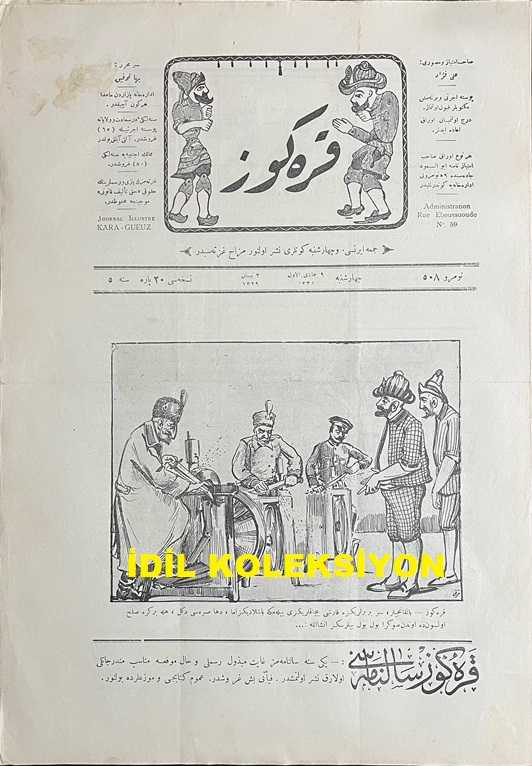 Osmanlıca Karagöz Mizah Dergisi-Gazetesi, Orijinal Dönem Basım, (Ottoman Magazine-Newspaper-Journal Illustré Kara-Gueuz) - 16 Nisan 1913 - Sayı: 508 - Hicri: 9 Cemaziyelevvel 1331 - Rumi: 3 Nisan 1329 - Karikatürist Ali Fuat Bey'in Çalışması: "Karagöz: Balkancılar, Siz Birbirlerinize Karşı Bıçaklarınızı Bilemeye Başladınız Amma, Daha Sırası Değil, Hele Bir Kere Sulh Olsun da Ondan Sonra Bol Bol Bilersiniz İnşallah!..." - Muhavere: Karagöz'ün Hazinesi - Akval-i Meşahir (Gazeteciler Arasında) - Karikatürist Ali Fuat Bey'in Çalışması: Zavallı Rumeli Ahalisi "Bizi İstiyorsunuz Değil mi?.. Köylü: Evet! Yunanlılar: Bizi İstiyorsunuz Değil mi? Köylü: Evet! Karagöz: Zavallı Ahali Size Değil, Arkanızdaki Silahlara 'Evet' Diyor!...", Baha Tevfik tarafından kaleme alınmıştır. Kitap 1913 yılında Sahib-i İmtiyaz ve Musavviri: Ali Fuat tarafından [İstanbul] yayınlanmıştır. Satışta olan kitap, yayınevinin 508. baskısıdır. 4 sayfadır. Osmanlıca Karagöz Mizah Dergisi-Gazetesi, Orijinal Dönem Basım, (Ottoman Magazine-Newspaper-Journal Illustré Kara-Gueuz) - 16 Nisan 1913 - Sayı: 508 - Hicri: 9 Cemaziyelevvel 1331 - Rumi: 3 Nisan 1329 - Karikatürist Ali Fuat Bey'in Çalışması: "Karagöz: Balkancılar, Siz Birbirlerinize Karşı Bıçaklarınızı Bilemeye Başladınız Amma, Daha Sırası Değil, Hele Bir Kere Sulh Olsun da Ondan Sonra Bol Bol Bilersiniz İnşallah!..." - Muhavere: Karagöz'ün Hazinesi - Akval-i Meşahir (Gazeteciler Arasında) - Karikatürist Ali Fuat Bey'in Çalışması: Zavallı Rumeli Ahalisi "Bizi İstiyorsunuz Değil mi?.. Köylü: Evet! Yunanlılar: Bizi İstiyorsunuz Değil mi? Köylü: Evet! Karagöz: Zavallı Ahali Size Değil, Arkanızdaki Silahlara 'Evet' Diyor!..." adlı eser Osmanlıca dilindedir.
