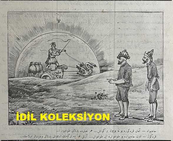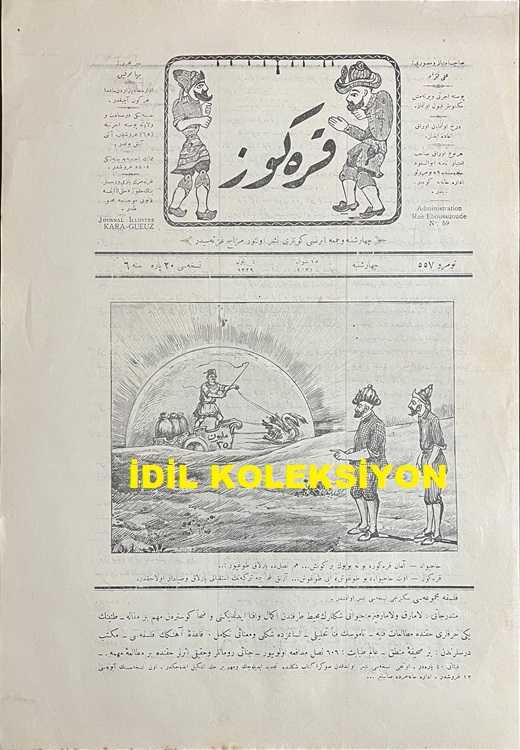 Osmanlıca Karagöz Mizah Dergisi-Gazetesi, Orijinal Dönem Basım, (Ottoman Magazine-Newspaper-Journal Illustré Kara-Gueuz) - 17 Eylül 1913 - Sayı: 557 - Hicri: 15 Şevval 1331 - Rumi: 4 Eylül 1329 - Karikatürist Ali Fuat Bey'in Çalışması: "Hacivat: Aman Karagöz, Bu Ne Büyük Bir Güneş... Hem Nasıl da Parlak Doğuyor!... Karagöz: Evet Hacivat, Bu Doğuş, İyi Doğuş... Artık Gam Yeme Türkiye'nin İstikbali parlak ve Ziyadar Olacaktır" - Fotoğraf: Uzunköprü'nün İstirdadı Günü Bulgarların Firar Ederken Katlettikleri Asker ve Ahaliden Bazıları., Baha Tevfik tarafından kaleme alınmıştır. Kitap 1913 yılında Sahib-i İmtiyaz ve Musavviri: Ali Fuat tarafından [İstanbul] yayınlanmıştır. Satışta olan kitap, yayınevinin 557. baskısıdır. 4 sayfadır. Osmanlıca Karagöz Mizah Dergisi-Gazetesi, Orijinal Dönem Basım, (Ottoman Magazine-Newspaper-Journal Illustré Kara-Gueuz) - 17 Eylül 1913 - Sayı: 557 - Hicri: 15 Şevval 1331 - Rumi: 4 Eylül 1329 - Karikatürist Ali Fuat Bey'in Çalışması: "Hacivat: Aman Karagöz, Bu Ne Büyük Bir Güneş... Hem Nasıl da Parlak Doğuyor!... Karagöz: Evet Hacivat, Bu Doğuş, İyi Doğuş... Artık Gam Yeme Türkiye'nin İstikbali parlak ve Ziyadar Olacaktır" - Fotoğraf: Uzunköprü'nün İstirdadı Günü Bulgarların Firar Ederken Katlettikleri Asker ve Ahaliden Bazıları. adlı eser Osmanlıca dilindedir.