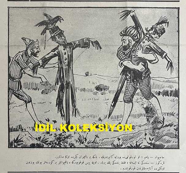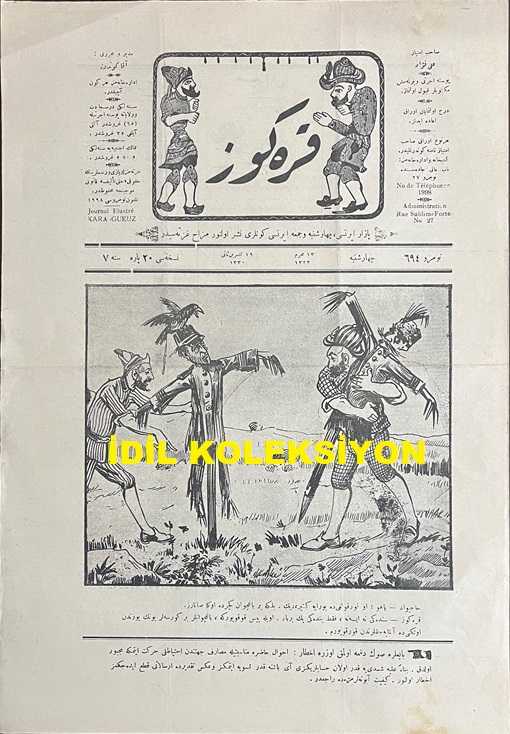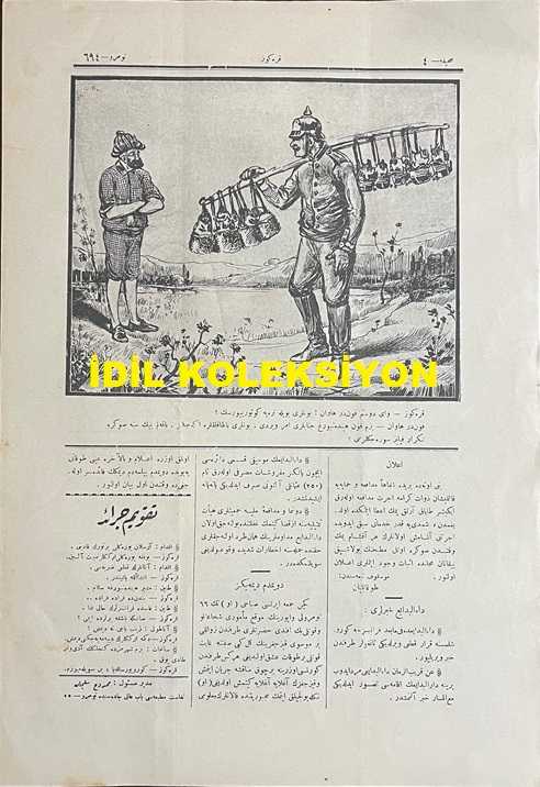Osmanlıca Karagöz Mizah Dergisi-Gazetesi, Orijinal Dönem Basım, (Ottoman Magazine-Newspaper-Journal Illustré Kara-Gueuz) - 2 Aralık 1914 - Sayı: 694 - Hicri: 13 Muharrem 1332 - Rumi: 19 Teşrin-i Sani 1330 - Karikatürist Ali Fuat Bey'in Çalışması: "Hacivat: Yahu! O Korkuluğu da Buraya Getir, Dik. Belki Bir Bahçıvan Geçer de Ona Satarız. Karagöz: Sendeki Ne İse Ne, Fakat Bendeki Pek Berbat. Öyle Pis Kokuyor ki, Bahçıvanlar Bir Görseler Bunun Yüzünden Ötekini de Almayacaklarından Korkuyorum" - Karikatürist Ali Fuat Bey'in Çalışması: "Karagöz: Vay Dostum Fonder Havan! Bunları Böyle Nereye Götürüyorsun? Fonder Havan: Bizim Fon Hindenburg Cenapları Emir Verdi. Bunları Bataklıklara Ekeceğiz. Bakalım Bin Sene Sonra Tekrar Filiz Sürecekler mi?" adlı eser, Kitap > Süreli Yayınlar > Gazeteler > Türkiye > Genel kategorisinde İkinci El olarak satıştadır.