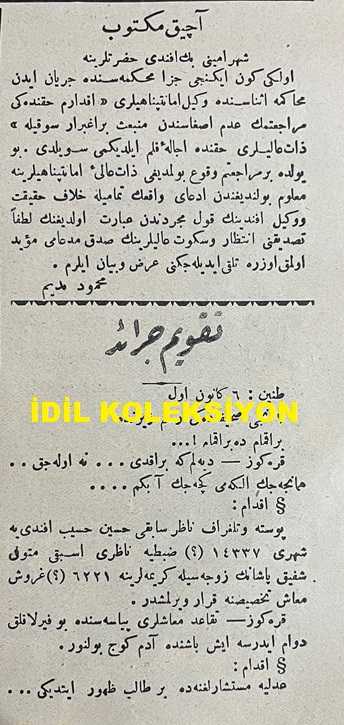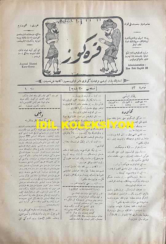Osmanlıca Karagöz Mizah Dergisi-Gazetesi, Orijinal Dönem Basım, (Ottoman Magazine-Newspaper-Journal Illustré Kara-Gueuz) - 21 Aralık 1908 - Sayı: 43 - Hicri: 27 Zilkade 1326 - Rumi: 8 Kanun-i Evvel 1324 - Mahut Gazetenin Lisanından: Nice Yıl Mesned-i Bala-yı Gazetede Karar Ettim Edip Hırsızlığı İcat Bıraktım Yadigar Ettim. Değil Maliyeden Adliyeden Yalnız Çalıp Çarptım Serapa Milleti Soydum da Kesb-i İştihar Ettim.... - Karikatür: "Hacivat: Karagöz... Bu Balya Ne... Bu Kıyafet Ne?... A... Unuttun mu Birader... Hamalların Memurinden Olduğu İddia Edilmiyor muydu... Hacivat: Demek Badema Böyle Redingotla... Karagöz: Her Vakit Değil... Yalnız Avusturya Emtiası Taşımak İcap Edince..." - Şehremini Beyefendi'ye Açık Mektup, Mahmut Nedim tarafından kaleme alınmıştır. Kitap 1908 yılında Sahib-i İmtiyaz ve Musavviri: Ali Fuat tarafından [İstanbul] yayınlanmıştır. Satışta olan kitap, yayınevinin 43. baskısıdır. 4 sayfadır. Osmanlıca Karagöz Mizah Dergisi-Gazetesi, Orijinal Dönem Basım, (Ottoman Magazine-Newspaper-Journal Illustré Kara-Gueuz) - 21 Aralık 1908 - Sayı: 43 - Hicri: 27 Zilkade 1326 - Rumi: 8 Kanun-i Evvel 1324 - Mahut Gazetenin Lisanından: Nice Yıl Mesned-i Bala-yı Gazetede Karar Ettim Edip Hırsızlığı İcat Bıraktım Yadigar Ettim. Değil Maliyeden Adliyeden Yalnız Çalıp Çarptım Serapa Milleti Soydum da Kesb-i İştihar Ettim.... - Karikatür: "Hacivat: Karagöz... Bu Balya Ne... Bu Kıyafet Ne?... A... Unuttun mu Birader... Hamalların Memurinden Olduğu İddia Edilmiyor muydu... Hacivat: Demek Badema Böyle Redingotla... Karagöz: Her Vakit Değil... Yalnız Avusturya Emtiası Taşımak İcap Edince..." - Şehremini Beyefendi'ye Açık Mektup adlı eser Osmanlıca dilindedir.