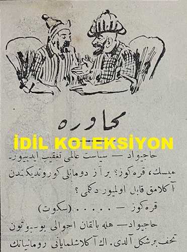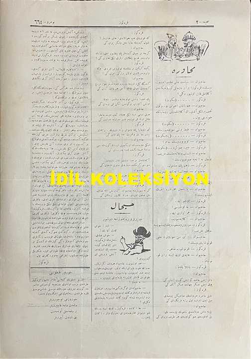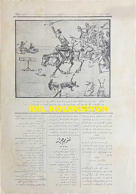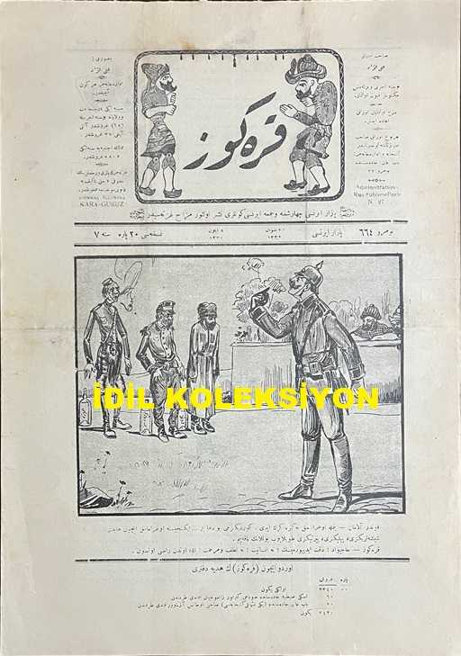 Osmanlıca Karagöz Mizah Dergisi-Gazetesi, Orijinal Dönem Basım, (Ottoman Magazine-Newspaper-Journal Illustré Kara-Gueuz) - 21 Eylül 1914 - Sayı: 664 - Hicri: 20 Şevval 1332 - Rumi: 8 Eylül 1330 - Karikatürist Ali Fuat Bey'in Çalışması: "Fonder Alaman: Benimle Uğraşmak Nenize Gerek İdi. Gördünüz mü Bu Daha Bir... İkincisine Uğramamak İçin Haydi! Şişelerinizi, Pılınızı, Pırtınızı Toplayıp Yollanın Bakayım. Karagöz: Hacivat! Dikkat Ediyor musun? Ne İnsaniyet! Ne Lütuf ve Merhamet! Allah Ondan Razı Olsun." - Karikatürist Ali Fuat Bey'in Çalışması: "Karagöz: Vay! Mister Con Kikirik! Böyle Dal Kılıç, Nereye Gidiyorsun? Con Kikirik: Gelmez Yılın Son Ayında Hazırlanacak Olan Beş Yüz Bin Milyon Kişilik Ordunun Pişdarlarını Aldım. Kemal-i Süratle Berlin'e Doğru Hücum Ediyorum. Karagöz: Öyle İse Yakınlaştın Mister Con! Hemen Gayret! Çıkmaz Ayın Son Çarşambasında Berlin'e Varırsın", Baha Tevfik tarafından kaleme alınmıştır. Kitap 1914 yılında Sahib-i İmtiyaz ve Musavviri: Ali Fuat tarafından [İstanbul] yayınlanmıştır. Satışta olan kitap, yayınevinin 664. baskısıdır. 4 sayfadır. Osmanlıca Karagöz Mizah Dergisi-Gazetesi, Orijinal Dönem Basım, (Ottoman Magazine-Newspaper-Journal Illustré Kara-Gueuz) - 21 Eylül 1914 - Sayı: 664 - Hicri: 20 Şevval 1332 - Rumi: 8 Eylül 1330 - Karikatürist Ali Fuat Bey'in Çalışması: "Fonder Alaman: Benimle Uğraşmak Nenize Gerek İdi. Gördünüz mü Bu Daha Bir... İkincisine Uğramamak İçin Haydi! Şişelerinizi, Pılınızı, Pırtınızı Toplayıp Yollanın Bakayım. Karagöz: Hacivat! Dikkat Ediyor musun? Ne İnsaniyet! Ne Lütuf ve Merhamet! Allah Ondan Razı Olsun." - Karikatürist Ali Fuat Bey'in Çalışması: "Karagöz: Vay! Mister Con Kikirik! Böyle Dal Kılıç, Nereye Gidiyorsun? Con Kikirik: Gelmez Yılın Son Ayında Hazırlanacak Olan Beş Yüz Bin Milyon Kişilik Ordunun Pişdarlarını Aldım. Kemal-i Süratle Berlin'e Doğru Hücum Ediyorum. Karagöz: Öyle İse Yakınlaştın Mister Con! Hemen Gayret! Çıkmaz Ayın Son Çarşambasında Berlin'e Varırsın" adlı eser Osmanlıca dilindedir.