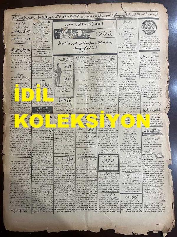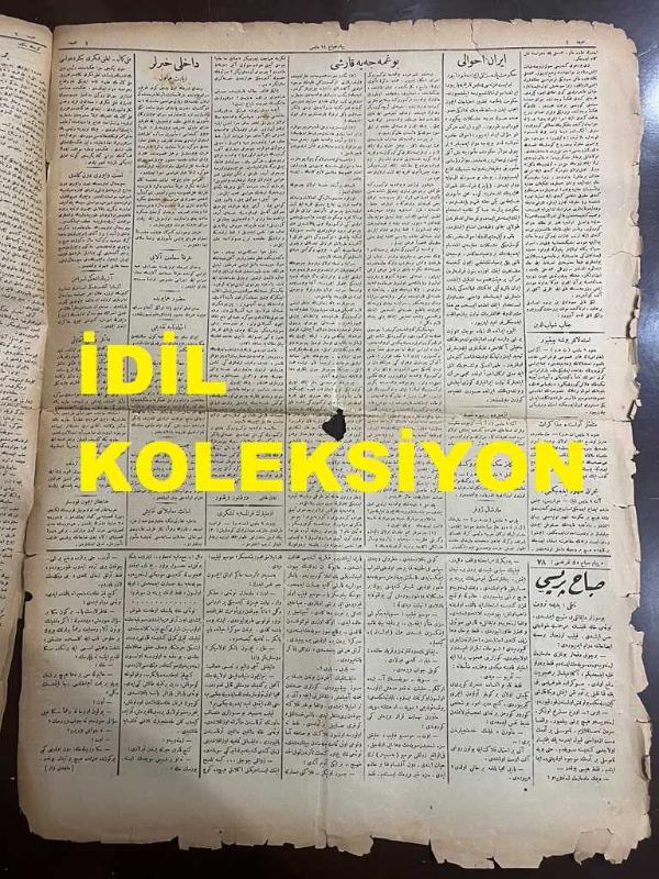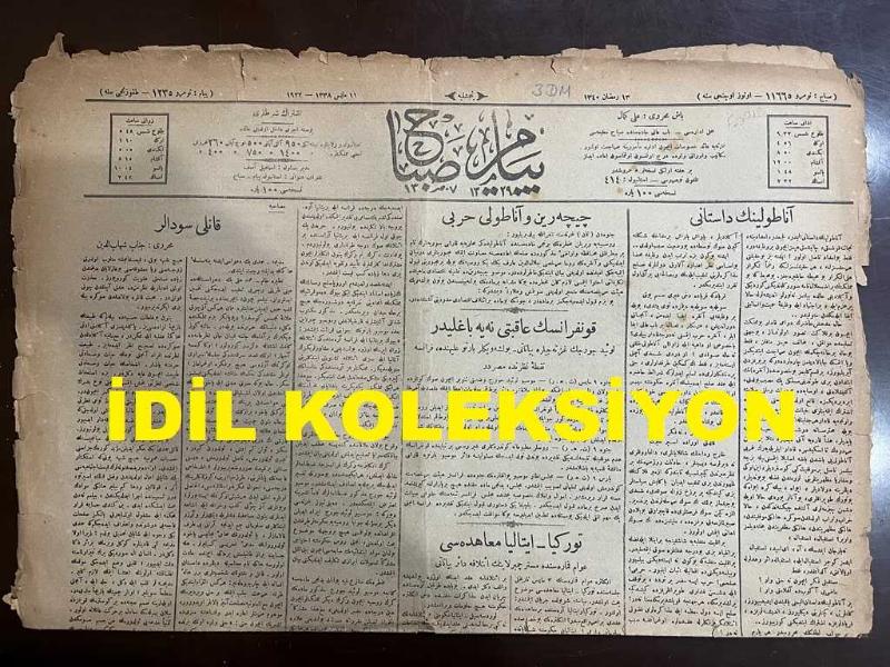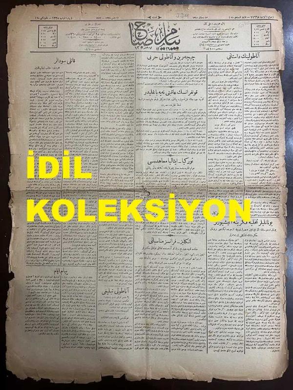 Osmanlıca Peyam-ı Sabah Gazetesi, Orijinal Dönem Basım, (Ottoman Newspaper) - 11 Mayıs 1922 - Sayı: 1235 - Hicri: 13 Ramazan 1340 - Rumi: 11 Mayıs 1338 - "Anadolu Destanı" '..İnönü ve Sakarya Mazhariyetlerini Lüzumundan Fazla Büyüttüler. "..Yunan İle Aramızdaki İhtilaf Ancak Müsalemetle, Siyasetle Biter. '..Ankara Harp Etmesini Ne Derece Kadar Bildi?" (Ali Kemal) - Yunanlılar Tahliye Fikrine Alışıyorlar: Yunan Ordusunun En Kızgın Unsurları Bile İkinci Bir Yunan Hükümetinin Teşekkülünü İstemezler - Çiçerin ve Anadolu Harbi - Konferansın Akıbeti Neye Bağlıdır: Loyd Corc'un Gazetecilere Beyanatı-Bolşevikler Barto Aleyhinde, Fransa Nokta-i Nazarında Musırdır - Türkiye-İtalya Muahedesi Avam Kamarasında Mister Çembırlayn'ın İtilafa Dair Beyanatı - İngiliz-Fransız Münasebatı Hakkında Loyd Corc-Barto Arasında Teati Olunan Mektuplar - Gunaris Kabinesinde İhtilaf - Musahebe: "Kanlı Sevdalar", Muharriri Cenap Şahabettin - Ali Kemal-Lütfi Fikri Beyler Davası - İzmir'de Kral Aleyhinde Suikast adlı eser, Kitap > Süreli Yayınlar > Gazeteler > Türkiye > Genel kategorisinde İkinci El olarak satıştadır.