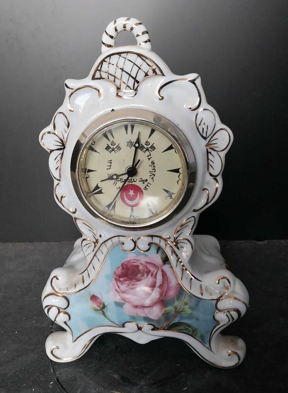 Osmanlıca Porselen Masa Saati. Osmanlıca Rakamlı Dekorluk Masa Saati, Saat Çalışmıyor Bakım Yapılmalı başlıklı antika/koleksiyon objesi Türkiye menşe’lidir. 1920-1940 arası dönemine aittir.