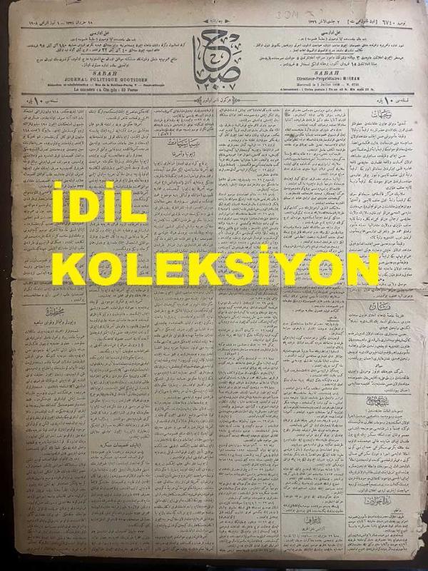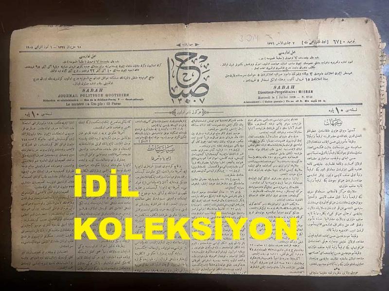 Osmanlıca Sabah Gazetesi, Orijinal dönem basım - 1 Temmuz 1908 - Sayı: 6740 - Hicri 2 Cemaziyelahire 1326 - Rumi 18 Haziran 1324 - 1 Temmuz efrencî 1908 - Tevcihat Kayıtları - Japonya Ve Amerika Arasında Savaş İhtimali - İtalya'da Tahsisat-ı Askeriye - Purgen Müessir Müshil - Tobler Çikolata Reklamı, Mihran Efendi (APİKYAN) tarafından kaleme alınmıştır. Kitap 1909 [Hicri: 1326] [Rûmi: 1324] yılında [Bab-ı Ali - Constantinople] yayınlanmıştır. Satışta olan kitap, yayınevinin 6.740. baskısıdır. 4 sayfadır. Osmanlıca Sabah Gazetesi, Orijinal dönem basım - 1 Temmuz 1908 - Sayı: 6740 - Hicri 2 Cemaziyelahire 1326 - Rumi 18 Haziran 1324 - 1 Temmuz efrencî 1908 - Tevcihat Kayıtları - Japonya Ve Amerika Arasında Savaş İhtimali - İtalya'da Tahsisat-ı Askeriye - Purgen Müessir Müshil - Tobler Çikolata Reklamı adlı eser Osmanlıca dilindedir.
