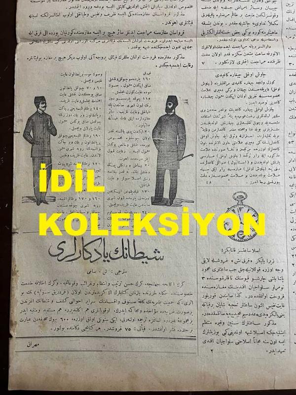 Osmanlıca Sabah Gazetesi, Orijinal dönem basım - 11 Temmuz 1890 - Sayı: 313 - Hicri 24 Zilkade 1307 - Rumi 29 Haziran 1306 - Makri Köyü' (Bakırköy) nde Baruthane-i Amire Dibeklerinden Birisi Ateş Almış İse De Baruthaneye Zarar Gelmemiştir - Siroz'da Bir Köylünün Rüyasına İstinaden Yapılan Kazıda Altın Kaplı Bir Kılıç İle Yaklaşık İki Yüz Dirhem Altın Kilise Lambasının Çıkarılması - Mekteb-i Sultani'nin Tevzi-i Mükafat Resmi Ve Mektep Müdürü İsmail Bey İle Münif Paşa'nın Nutukları - Japonya Ülkesinde Görülen Terakkiyata Dair - Şemsettin Sami Bey'in Frédéric Soulié'den Çevirisi "Şeytanın Yadigarları", Mihran Efendi (APİKYAN) tarafından kaleme alınmıştır. Kitap 1890 [Hicri: 1307] [Rûmi: 1306] yılında [Bab-ı Ali - Constantinople] yayınlanmıştır. Satışta olan kitap, yayınevinin 313. baskısıdır. 4 sayfadır. Osmanlıca Sabah Gazetesi, Orijinal dönem basım - 11 Temmuz 1890 - Sayı: 313 - Hicri 24 Zilkade 1307 - Rumi 29 Haziran 1306 - Makri Köyü' (Bakırköy) nde Baruthane-i Amire Dibeklerinden Birisi Ateş Almış İse De Baruthaneye Zarar Gelmemiştir - Siroz'da Bir Köylünün Rüyasına İstinaden Yapılan Kazıda Altın Kaplı Bir Kılıç İle Yaklaşık İki Yüz Dirhem Altın Kilise Lambasının Çıkarılması - Mekteb-i Sultani'nin Tevzi-i Mükafat Resmi Ve Mektep Müdürü İsmail Bey İle Münif Paşa'nın Nutukları - Japonya Ülkesinde Görülen Terakkiyata Dair - Şemsettin Sami Bey'in Frédéric Soulié'den Çevirisi "Şeytanın Yadigarları" adlı eser Osmanlıca dilindedir.