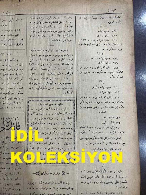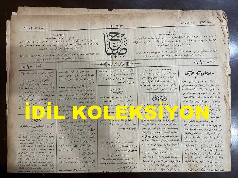 Osmanlıca Sabah Gazetesi, Orijinal dönem basım - 22 Mayıs 1890 - Sayı: 263 - Hicri 3 Şevval 1307 - Rumi 10 Mayıs 1306 - Sultan II. Abdülhamit'in Beşiktaş'ta Sinan Paşa Camii'nde Selamlık Resminin İcrası - Ramazan Bayramı Dolayısıyla Dolmabahçe Sarayı'nda Tertip Olunan Resmi Tören - Ramazan Bayramı'nın Birinci Günü Hırka-i Şerif Ziyareti Esnasında Yol Güzergahı Üzerinde Tazim ve Tekrimde Bulunan Müslim Ve Gayr-i Müslim Öğrencilere Atıyyeler Verilmesi - Ramazan Bayramı Dolayısıyla Hapishanelerde Cesasının Üçte Birini Tamamlayan Mahkumların Salıverilmesi - Papa 13. Leon Hazretleri Tarafından Posta Ve Telgraf Nazırı Hasan Ali Efendi'ye Peynof Nişanının Takdimi - İzmit'ten Adapazarı'na Kadar Temdid Olunan Şimendifer Şubesinin Resm-i Küşadının Yakında Gerçekleştirileceği - İzmit'ten Sapanca'ya Kadar Temdid Olunan Kırk Kilometrelik Hattın İnşasının Bitmeye Yakın Olduğu - Rusya, Fransa, Almanya, Avusturya, İngiltere Devletlerinin Asker Sayılarına Dair Bir İcmal, Mihran Efendi (APİKYAN) tarafından kaleme alınmıştır. Kitap 1890 [Hicri: 1307] [Rûmi: 1306] yılında [Bab-ı Ali - Constantinople] yayınlanmıştır. Satışta olan kitap, yayınevinin 263. baskısıdır. 4 sayfadır. Osmanlıca Sabah Gazetesi, Orijinal dönem basım - 22 Mayıs 1890 - Sayı: 263 - Hicri 3 Şevval 1307 - Rumi 10 Mayıs 1306 - Sultan II. Abdülhamit'in Beşiktaş'ta Sinan Paşa Camii'nde Selamlık Resminin İcrası - Ramazan Bayramı Dolayısıyla Dolmabahçe Sarayı'nda Tertip Olunan Resmi Tören - Ramazan Bayramı'nın Birinci Günü Hırka-i Şerif Ziyareti Esnasında Yol Güzergahı Üzerinde Tazim ve Tekrimde Bulunan Müslim Ve Gayr-i Müslim Öğrencilere Atıyyeler Verilmesi - Ramazan Bayramı Dolayısıyla Hapishanelerde Cesasının Üçte Birini Tamamlayan Mahkumların Salıverilmesi - Papa 13. Leon Hazretleri Tarafından Posta Ve Telgraf Nazırı Hasan Ali Efendi'ye Peynof Nişanının Takdimi - İzmit'ten Adapazarı'na Kadar Temdid Olunan Şimendifer Şubesinin Resm-i Küşadının Yakında Gerçekleştirileceği - İzmit'ten Sapanca'ya Kadar Temdid Olunan Kırk Kilometrelik Hattın İnşasının Bitmeye Yakın Olduğu - Rusya, Fransa, Almanya, Avusturya, İngiltere Devletlerinin Asker Sayılarına Dair Bir İcmal adlı eser Osmanlıca dilindedir.