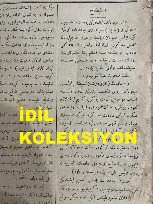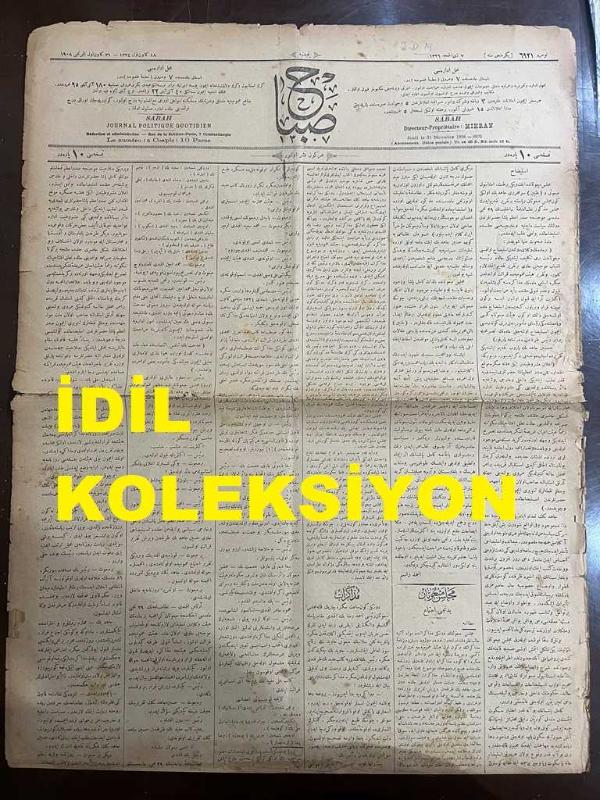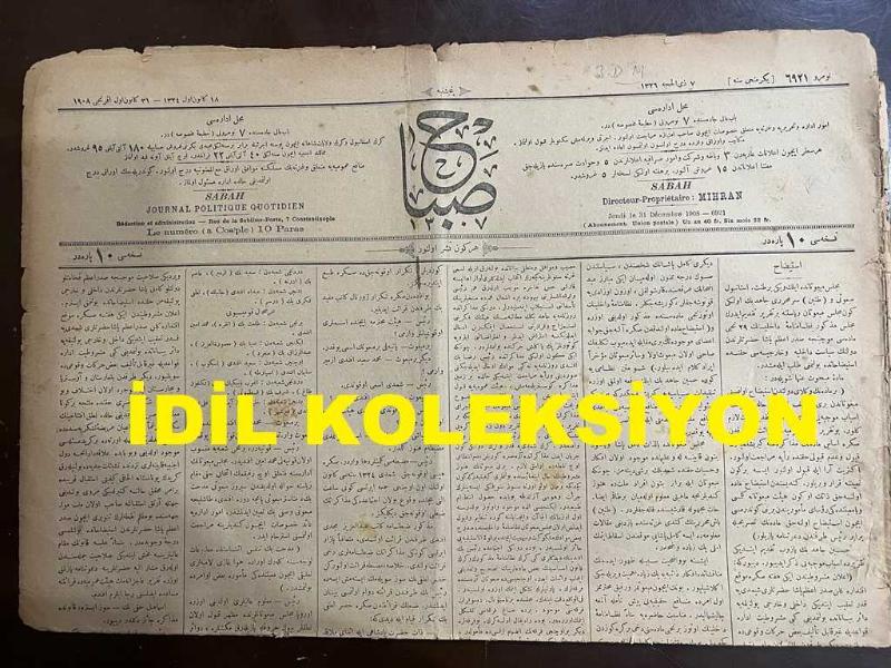 Osmanlıca Sabah Gazetesi, Orijinal dönem basım - 31 Aralık 1908 - Sayı: 6921 - Hicri 7 Zillhicce 1326 - Rumi 18 Kanun-i evvel 1324 - 21 Kanun-i evvel efrencî 1908 - İstizah - Ahmet Rasim İmzalı Makale - Meclis-i Mebusan Müzakerelerine Dair Kayıtlar - İtalya Depremine Dair - Çırçır Harik İanesi - İki Caninin İdama Mahkumiyeti adlı eser, Kitap > Süreli Yayınlar > Gazeteler > Türkiye > Genel kategorisinde İkinci El olarak satıştadır.