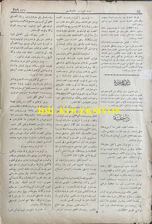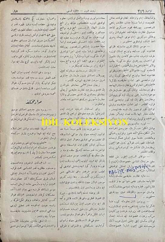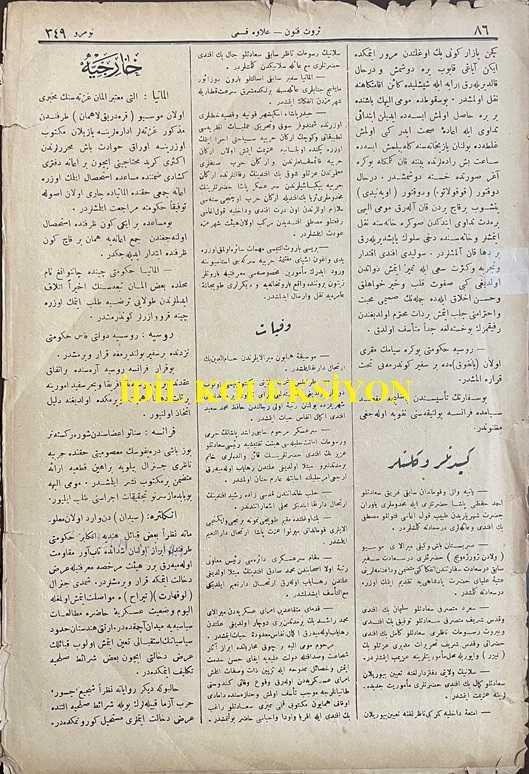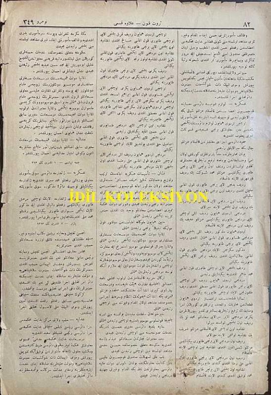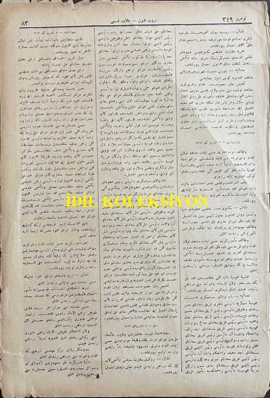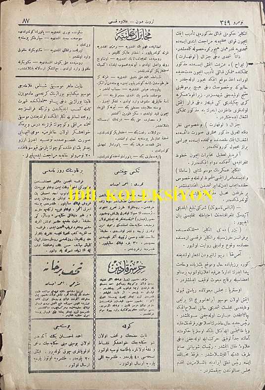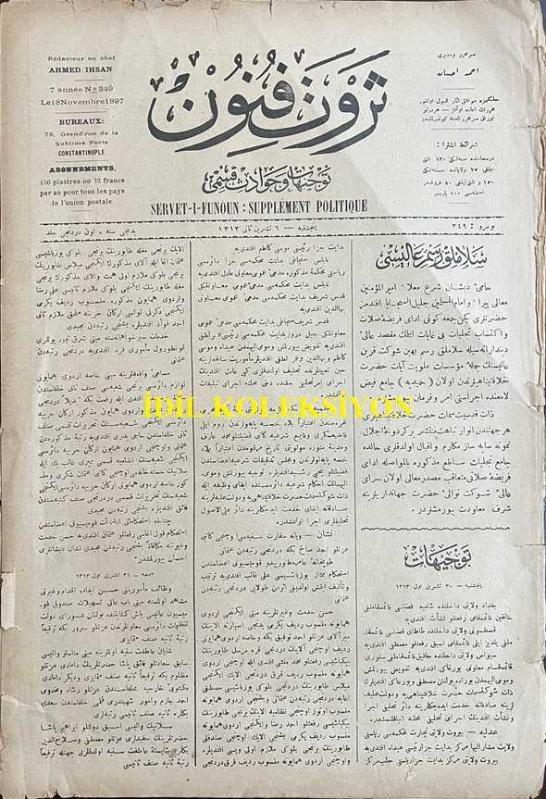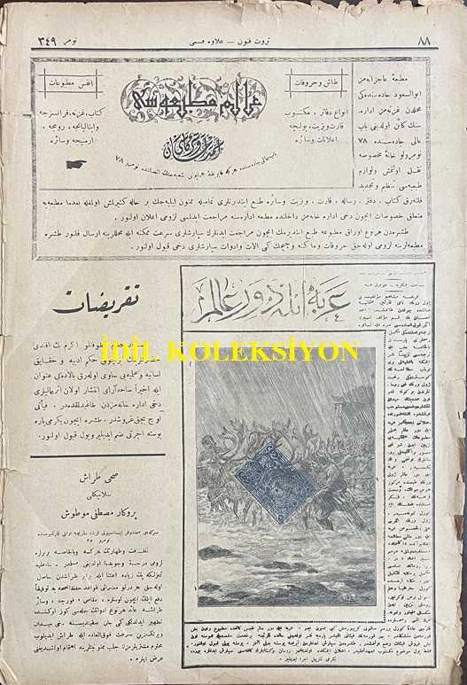 Osmanlıca Servet-i Fünun Dergisi, Orijinal Dönem Basım, (Ottoman Magazine) - 18 Kasım 1897 - Sayı: 349 - Rumi: 6 Teşrin-i Sani 1313 - Sultan II. Abdülhamit'in Hamidiye Camii'nde Cuma Selamlık Töreni - Muahede-i Katiye Müzakeresi Bu Hafta Dahi Ber Mutad Hariciye Nezaret-i Celilesi Dairesinde Akd-i İctima Eylemiş ve Geç Vakitlere Kadar Müzakerata Devam Olunmuştur - Golos ile Sair Kasaba ve Şehirlerde Dakik Depoları Tesis ve Küşat Olunacaktır. Golos Tarikiyle Muhacirler Avdete Başlamışlardır - Amerika Kıtasında Bulunan Ehl-i İslam Cem-i İane ile Şüheda ve Mecruh Gaziler Sergisine İrsal Etmişlerdir - Erzincan Erzurum ve Samsun ve Hudud-ı Hakaniye Kadar İnşası Taht-ı Karara Alınarak Ameliyat ve İnşaatına İbtidar Edilmiş Olan Turuk-ı Askeriye, Ahmet İhsan TOKGÖZ tarafından kaleme alınmıştır. Kitap 1897 yılında [İstanbul] yayınlanmıştır. Satışta olan kitap, yayınevinin 349. baskısıdır. 8 sayfadır. Osmanlıca Servet-i Fünun Dergisi, Orijinal Dönem Basım, (Ottoman Magazine) - 18 Kasım 1897 - Sayı: 349 - Rumi: 6 Teşrin-i Sani 1313 - Sultan II. Abdülhamit'in Hamidiye Camii'nde Cuma Selamlık Töreni - Muahede-i Katiye Müzakeresi Bu Hafta Dahi Ber Mutad Hariciye Nezaret-i Celilesi Dairesinde Akd-i İctima Eylemiş ve Geç Vakitlere Kadar Müzakerata Devam Olunmuştur - Golos ile Sair Kasaba ve Şehirlerde Dakik Depoları Tesis ve Küşat Olunacaktır. Golos Tarikiyle Muhacirler Avdete Başlamışlardır - Amerika Kıtasında Bulunan Ehl-i İslam Cem-i İane ile Şüheda ve Mecruh Gaziler Sergisine İrsal Etmişlerdir - Erzincan Erzurum ve Samsun ve Hudud-ı Hakaniye Kadar İnşası Taht-ı Karara Alınarak Ameliyat ve İnşaatına İbtidar Edilmiş Olan Turuk-ı Askeriye adlı eser Osmanlıca dilindedir.
