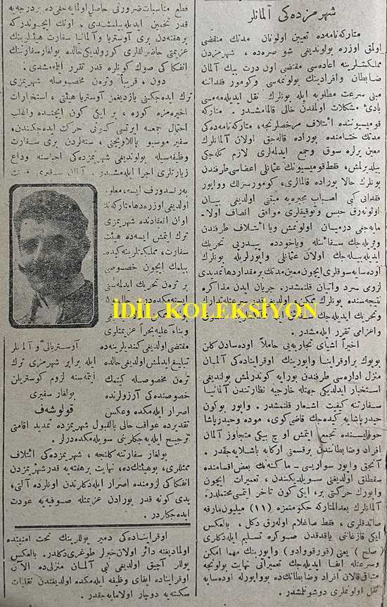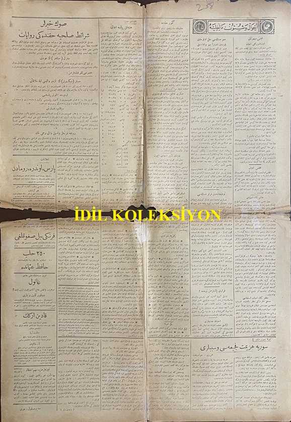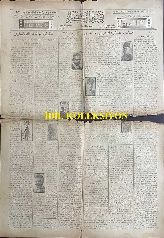 Osmanlıca Tasvir-i Efkar Gazetesi, Orijinal Dönem Basım, (Ottoman Newspaper) - 29 Kasım 1918 - Sayı: 2575 - Hicri: 26 Safer 1337 - Rumi: 29 Teşrin-i Sani 1334 - Siyasiyat: 'Hep kendimiz Yapacağız!' Ebüzziya-zade - Mütekaidin-i Askeriyenin Tavzifi Meselesi - (Fotoğraflar) Enver Paşa'nın Pek Yolsuz Surette Tekaüde Sevk Ettiği Muktedir ve Tecrübeli Ümeramızdan Çürüksulu Mahmut Paşa - Harb-i Hazırın Bidayetinde Enver Paşa'nın Ancak Şahsi Düşüncelerle Tekaüde Sevk Eylediği Mütefennin ve Muabassır Ümeramızdan Nafıa Nazır-ı Sabıkı Ziya Paşa - Berlin Sefir-i Sabıkı Olup Cesareti ve Malumatıyla Meşhur Olan ve Enver Paşa Tarafından Takaüde Sevk Olunan Mahmut Muhtar Paşa - Teşkilatla Hareketin İlk Faideleri - Teşkilatsızlık Şuriş Tevlid Eder - İrtibat Komiserlikleri - Muhtelit İnzibat Müfrezeleri - Semerat-ı Müfide Husule Geliyor - İtilaf İspanya'yı da Kazandı - Şehrimizdeki Sabık Müttefikler Süferası - Osmanlı-Fransız Münasebat-ı Ticariyesi - Şehrimizdeki Almanlar adlı eser, Kitap > Süreli Yayınlar > Gazeteler > Türkiye > Genel kategorisinde İkinci El olarak satıştadır.