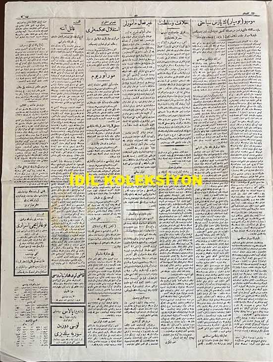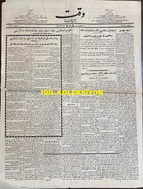 Osmanlıca Vakit Gazetesi, Orijinal Dönem Basım, (Ottoman Newspaper) - 13 Ocak 1923 - Sayı: 1838 - Hicri: 5 Cemaziyelahir 1341 - Rumi: 13 Kanun-i Sani 1339 - Nüfus Mübadelesi Hakkında Tanzim Edilen Mukavelenamenin Müzakeresi - Yunanistan'daki Türklerle Türkiye'deki Rumların Mübadelesi - Mübadele Komisyonu Tarafından Müzakeresine Başlanılan Mukavelenamenin Metni - Musul Meselesi Hükme Terk Edilecek. Bu Husustaki Şayialar Tekzip Olunmuştur - Lozan'da Hazırlanan Muahede Projesi - "İstinat Noktası" Ahmet Emin (Yalman) - "Napolyon'u Sevmiyorum, Şahsı İçin Uğraşmıştır" Bu Sözleri Mustafa Kemal Paşa Hazretleri Morning Post Muhabiresine Söylemiştir. İngiliz Gazetecisi Paşamızı Göklere Çıkarıyor - Piyer Loti Günü: Bugün Bütün Türkler Büyük Dostlarını Tevkir Ediyorlar - Hilafet ve Saltanat Tefriki Hakkında Şeyh Senusi Hazretlerinin Fikri adlı eser, Kitap > Süreli Yayınlar > Gazeteler > Türkiye > Genel kategorisinde İkinci El olarak satıştadır.