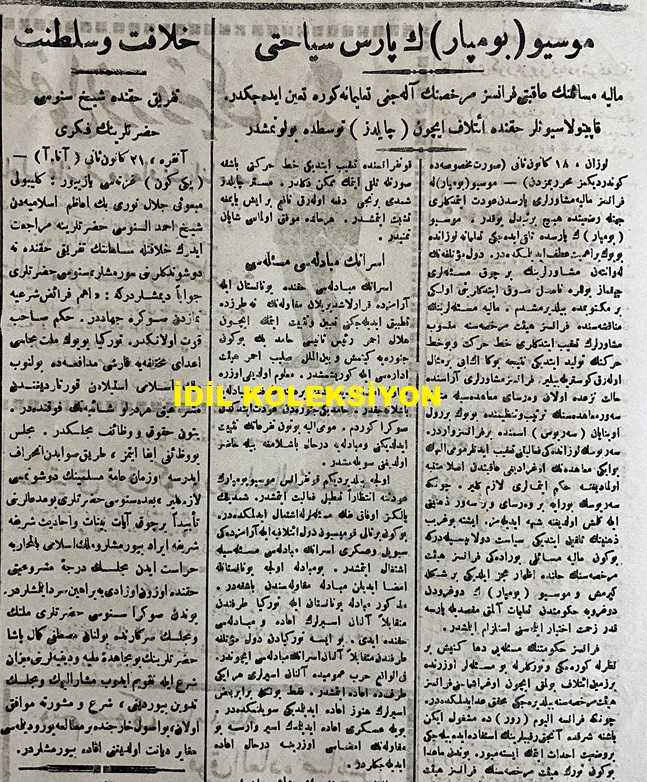 Osmanlıca Vakit Gazetesi, Orijinal Dönem Basım, (Ottoman Newspaper) - 13 Ocak 1923 - Sayı: 1838 - Hicri: 5 Cemaziyelahir 1341 - Rumi: 13 Kanun-i Sani 1339 - Nüfus Mübadelesi Hakkında Tanzim Edilen Mukavelenamenin Müzakeresi - Yunanistan'daki Türklerle Türkiye'deki Rumların Mübadelesi - Mübadele Komisyonu Tarafından Müzakeresine Başlanılan Mukavelenamenin Metni - Musul Meselesi Hükme Terk Edilecek. Bu Husustaki Şayialar Tekzip Olunmuştur - Lozan'da Hazırlanan Muahede Projesi - "İstinat Noktası" Ahmet Emin (Yalman) - "Napolyon'u Sevmiyorum, Şahsı İçin Uğraşmıştır" Bu Sözleri Mustafa Kemal Paşa Hazretleri Morning Post Muhabiresine Söylemiştir. İngiliz Gazetecisi Paşamızı Göklere Çıkarıyor - Piyer Loti Günü: Bugün Bütün Türkler Büyük Dostlarını Tevkir Ediyorlar - Hilafet ve Saltanat Tefriki Hakkında Şeyh Senusi Hazretlerinin Fikri, Ahmet Emin (YALMAN) tarafından kaleme alınmıştır. Kitap 1923 yılında [İstanbul] yayınlanmıştır. Satışta olan kitap, yayınevinin 1.838. baskısıdır. 4 sayfadır. Osmanlıca Vakit Gazetesi, Orijinal Dönem Basım, (Ottoman Newspaper) - 13 Ocak 1923 - Sayı: 1838 - Hicri: 5 Cemaziyelahir 1341 - Rumi: 13 Kanun-i Sani 1339 - Nüfus Mübadelesi Hakkında Tanzim Edilen Mukavelenamenin Müzakeresi - Yunanistan'daki Türklerle Türkiye'deki Rumların Mübadelesi - Mübadele Komisyonu Tarafından Müzakeresine Başlanılan Mukavelenamenin Metni - Musul Meselesi Hükme Terk Edilecek. Bu Husustaki Şayialar Tekzip Olunmuştur - Lozan'da Hazırlanan Muahede Projesi - "İstinat Noktası" Ahmet Emin (Yalman) - "Napolyon'u Sevmiyorum, Şahsı İçin Uğraşmıştır" Bu Sözleri Mustafa Kemal Paşa Hazretleri Morning Post Muhabiresine Söylemiştir. İngiliz Gazetecisi Paşamızı Göklere Çıkarıyor - Piyer Loti Günü: Bugün Bütün Türkler Büyük Dostlarını Tevkir Ediyorlar - Hilafet ve Saltanat Tefriki Hakkında Şeyh Senusi Hazretlerinin Fikri adlı eser Osmanlıca dilindedir.