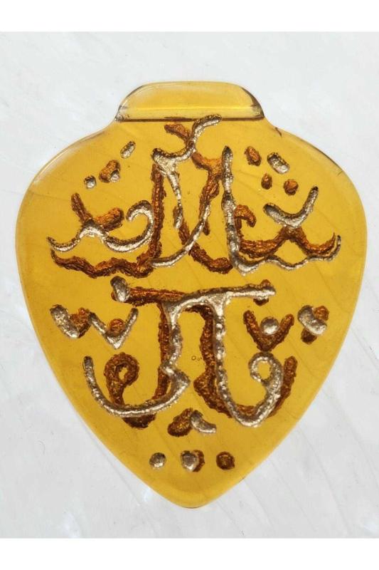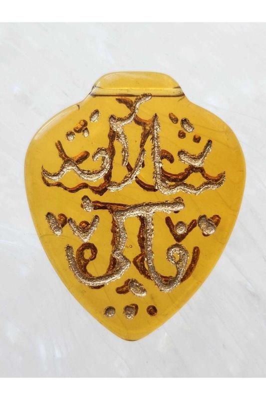 Osmanlıca Yazılı Cam Kolye Ucu Sarı. Eski döneme ait komple cam üzeri başlıklı antika/koleksiyon objesinin menşei belirtilmemiştir. Objenin ait olduğu dönem bilinmeketedir.