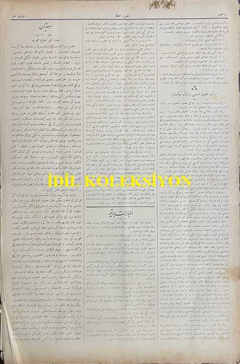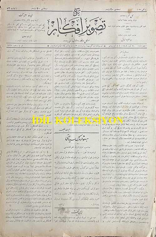 Osmanlıca Yeni Tasvir-i Efkar Gazetesi, Orijinal Dönem Basım, (Ottoman Newspaper) - 21 Temmuz 1909 - Sayı: 52 - Hicri: 4 Recep 1327 ve 8 Temmuz Rumi - Misafirlerimiz: Bulgaristan Darülfünun'u Talebesinden Beş, Altı Yüz Kadar Genç, Meşrutiyet-i Osmaniye'yi Payitahtında Selamlamak İçin Dün İstanbul'a Geldiler" Süleyman Nazif - Iyd-i Milli: Temmuzun Onuncu Yevm-i Mesuduna Müsadif Cuma Günü ve Akşamında Dersaadet ve Bilad-ı Selase Devair-i Belediyesince İcra Kılınacak Iyd-i Milli Şenliklerinin Programı - Şam Mekteb-i Tıbbiyesi - Londra'da Heyet-i Mebusa-i Osmaniye - Yunanistan'da İhtilal-i Askeri - İran'da Kanun-i Esasi ve Tebeddül-i Hükümdar, Ebüzziya Tevfik tarafından kaleme alınmıştır. Kitap 1909 yılında [İstanbul] yayınlanmıştır. Satışta olan kitap, yayınevinin 52. baskısıdır. 8 sayfadır. Osmanlıca Yeni Tasvir-i Efkar Gazetesi, Orijinal Dönem Basım, (Ottoman Newspaper) - 21 Temmuz 1909 - Sayı: 52 - Hicri: 4 Recep 1327 ve 8 Temmuz Rumi - Misafirlerimiz: Bulgaristan Darülfünun'u Talebesinden Beş, Altı Yüz Kadar Genç, Meşrutiyet-i Osmaniye'yi Payitahtında Selamlamak İçin Dün İstanbul'a Geldiler" Süleyman Nazif - Iyd-i Milli: Temmuzun Onuncu Yevm-i Mesuduna Müsadif Cuma Günü ve Akşamında Dersaadet ve Bilad-ı Selase Devair-i Belediyesince İcra Kılınacak Iyd-i Milli Şenliklerinin Programı - Şam Mekteb-i Tıbbiyesi - Londra'da Heyet-i Mebusa-i Osmaniye - Yunanistan'da İhtilal-i Askeri - İran'da Kanun-i Esasi ve Tebeddül-i Hükümdar adlı eser Osmanlıca dilindedir.