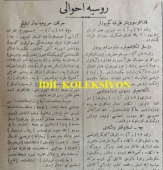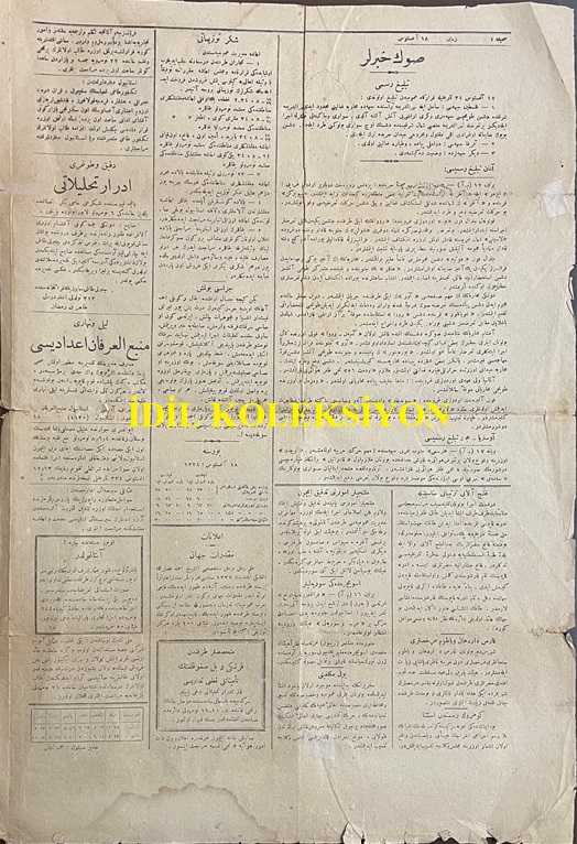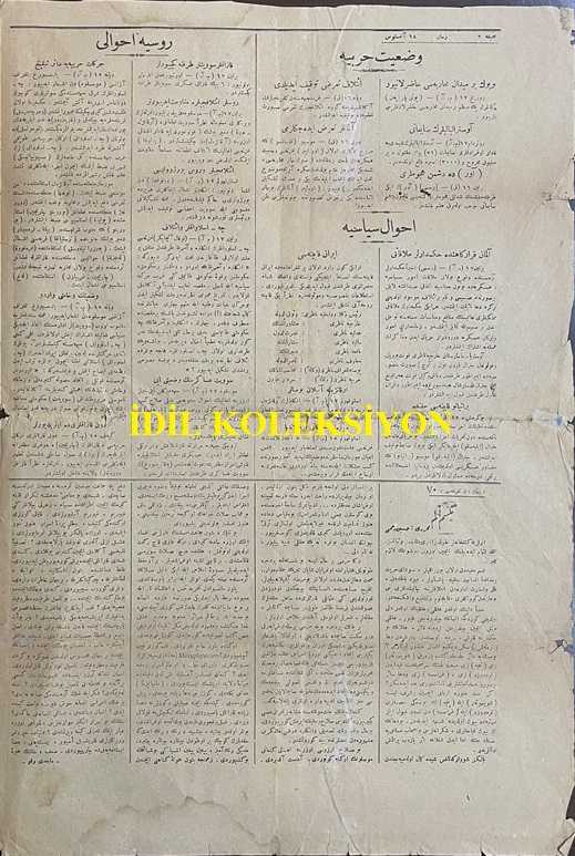 Osmanlıca Zaman Gazetesi, Orijinal Dönem Basım, (Ottoman Newspaper) - 18 Ağustos 1918 - Sayı: 134 - Hicri: 11 Zilkade 1336 - Rumi: 18 Ağustos 1334 - Muhalefet-i Gayr-i Meşrua - Kafkasya'da Neler Oluyor? - Bakü'de İngiliz Kuvveti - Sovyet Askerlerinin Şimal-i Kafkasya'ya Doğru Taarruzları - Türkiye ile Azerbaycan Arasındaki Münakit Muahede - Bolşevikler de Şimal-i Kafkasya İstikametinde Taarruz Ediyorlar - Türkiye-Azerbaycan Muahedesi - Alman Karargahında - (Fotoğraf) Alman Karargah-ı Umumisindeki Müzakerata İştirak Edenlerden Avusturya-Macaristan Erkan-ı Harbiye-i Umumiye Reisi Kolonel Ceneral Von Arz - (Fotoğraf) Müzakerata İştirak Edenlerden Avusturya-Macaristan Sabık Başvekili Mösyö Seidler - (Fotoğraf) Azerbaycan Kuvvetlerine Karşı Müdafaası İçin İngilizlerin Ahiren Bir Kuvve-i Askeriye Sevk Ettikleri Bakü Şehrinden Bir Manzara - Vaziyet-i Harbiye: Büyük Bir Meydan Muharebesi Hazırlanıyor - Almanlar Taarruz Edecekler mi? Ahval-i Siyasiye: Alman Karargahında Hükümdarlar Mülakatı adlı eser, Kitap > Süreli Yayınlar > Gazeteler > Türkiye > Genel kategorisinde İkinci El olarak satıştadır.