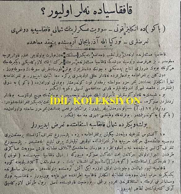 Osmanlıca Zaman Gazetesi, Orijinal Dönem Basım, (Ottoman Newspaper) - 18 Ağustos 1918 - Sayı: 134 - Hicri: 11 Zilkade 1336 - Rumi: 18 Ağustos 1334 - Muhalefet-i Gayr-i Meşrua - Kafkasya'da Neler Oluyor? - Bakü'de İngiliz Kuvveti - Sovyet Askerlerinin Şimal-i Kafkasya'ya Doğru Taarruzları - Türkiye ile Azerbaycan Arasındaki Münakit Muahede - Bolşevikler de Şimal-i Kafkasya İstikametinde Taarruz Ediyorlar - Türkiye-Azerbaycan Muahedesi - Alman Karargahında - (Fotoğraf) Alman Karargah-ı Umumisindeki Müzakerata İştirak Edenlerden Avusturya-Macaristan Erkan-ı Harbiye-i Umumiye Reisi Kolonel Ceneral Von Arz - (Fotoğraf) Müzakerata İştirak Edenlerden Avusturya-Macaristan Sabık Başvekili Mösyö Seidler - (Fotoğraf) Azerbaycan Kuvvetlerine Karşı Müdafaası İçin İngilizlerin Ahiren Bir Kuvve-i Askeriye Sevk Ettikleri Bakü Şehrinden Bir Manzara - Vaziyet-i Harbiye: Büyük Bir Meydan Muharebesi Hazırlanıyor - Almanlar Taarruz Edecekler mi? Ahval-i Siyasiye: Alman Karargahında Hükümdarlar Mülakatı, Refik Halit KARAY tarafından kaleme alınmıştır. Kitap 1918 yılında [İstanbul] yayınlanmıştır. Satışta olan kitap, yayınevinin 134. baskısıdır. 4 sayfadır. Osmanlıca Zaman Gazetesi, Orijinal Dönem Basım, (Ottoman Newspaper) - 18 Ağustos 1918 - Sayı: 134 - Hicri: 11 Zilkade 1336 - Rumi: 18 Ağustos 1334 - Muhalefet-i Gayr-i Meşrua - Kafkasya'da Neler Oluyor? - Bakü'de İngiliz Kuvveti - Sovyet Askerlerinin Şimal-i Kafkasya'ya Doğru Taarruzları - Türkiye ile Azerbaycan Arasındaki Münakit Muahede - Bolşevikler de Şimal-i Kafkasya İstikametinde Taarruz Ediyorlar - Türkiye-Azerbaycan Muahedesi - Alman Karargahında - (Fotoğraf) Alman Karargah-ı Umumisindeki Müzakerata İştirak Edenlerden Avusturya-Macaristan Erkan-ı Harbiye-i Umumiye Reisi Kolonel Ceneral Von Arz - (Fotoğraf) Müzakerata İştirak Edenlerden Avusturya-Macaristan Sabık Başvekili Mösyö Seidler - (Fotoğraf) Azerbaycan Kuvvetlerine Karşı Müdafaası İçin İngilizlerin Ahiren Bir Kuvve-i Askeriye Sevk Ettikleri Bakü Şehrinden Bir Manzara - Vaziyet-i Harbiye: Büyük Bir Meydan Muharebesi Hazırlanıyor - Almanlar Taarruz Edecekler mi? Ahval-i Siyasiye: Alman Karargahında Hükümdarlar Mülakatı adlı eser Osmanlıca dilindedir.
