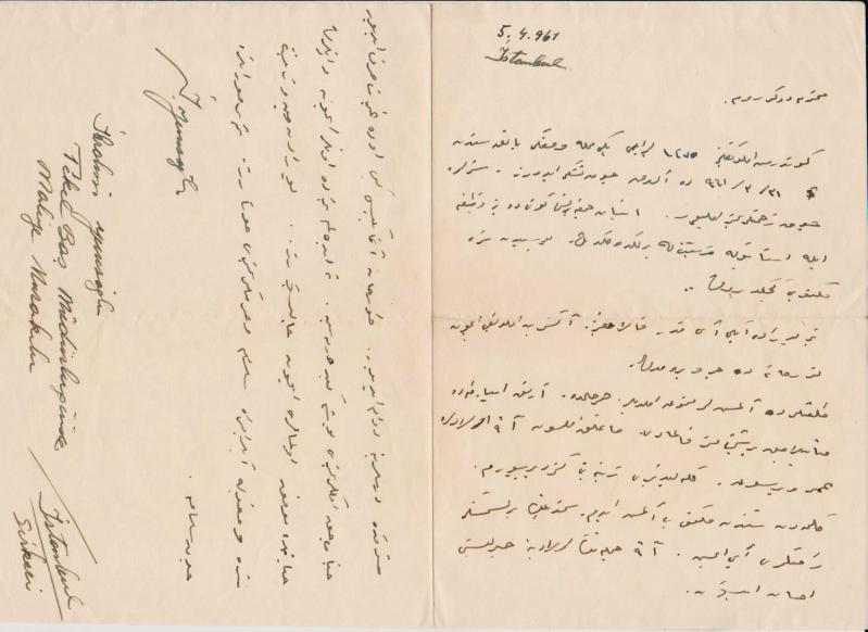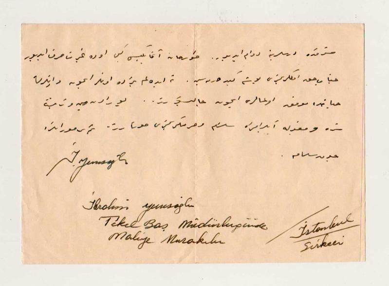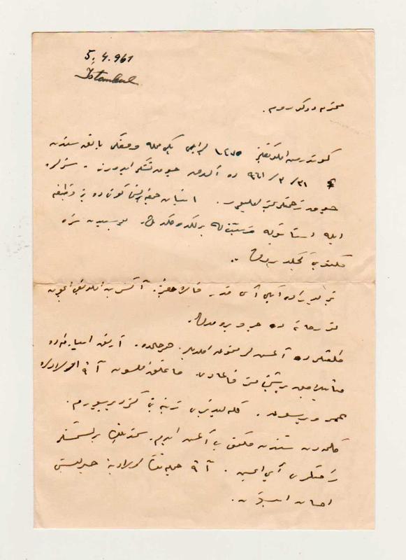 Orijinal Osmanlıca el yazısı mektup. 21,5x15 cm. Tamamı Osmanlıca. Bifolium üzerinde 2 sayfa. 5.4.1961 tarihli. İstanbul'dan yazılmış. "Muhterem dünürüm" diye başlıyor. Sirkeci - İstanbul'dan Tekel Başmüdürlüğü Maliye murakıbı İbrahim Yunusoğlu tarafından yazılmış. Özlem dolu, üsluplu ve geç dönem Osmanlıca ile yazılmış bir mektup.