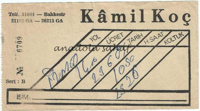 Otobüs Bileti: Kamil Koç Yolcu Bileti No. 6709