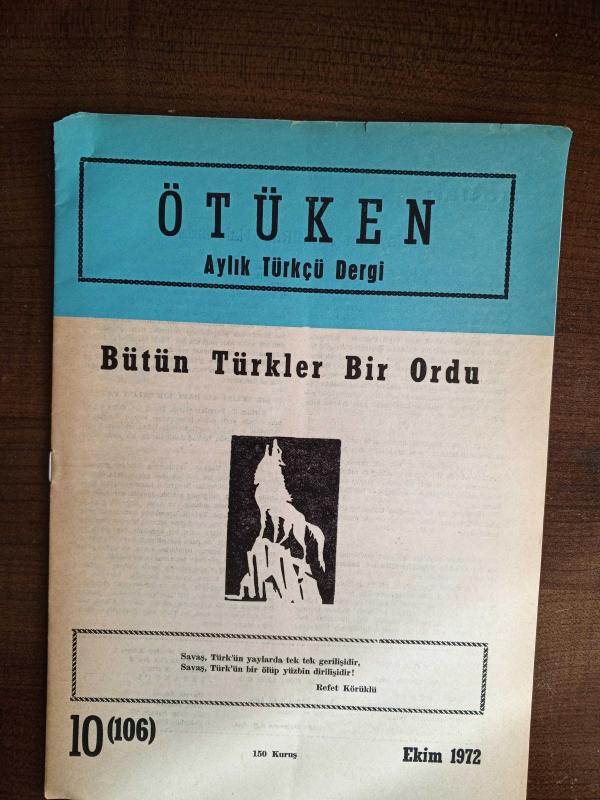 Ötüken - Aylık Türkçü Dergi. Bütün Türkler Bir Ordu. Sayı 10 (106) --- Ekim 1972, ATSIZ tarafından kaleme alınmıştır. Eser Necdet Sançar editörlüğünde hazırlanmıştır. Kitap 1972 yılında Ötüken tarafından [İstanbul] yayınlanmıştır. 16 sayfadır. Ötüken - Aylık Türkçü Dergi. Bütün Türkler Bir Ordu. Sayı 10 (106) --- Ekim 1972 adlı eser Türkçe dilindedir.