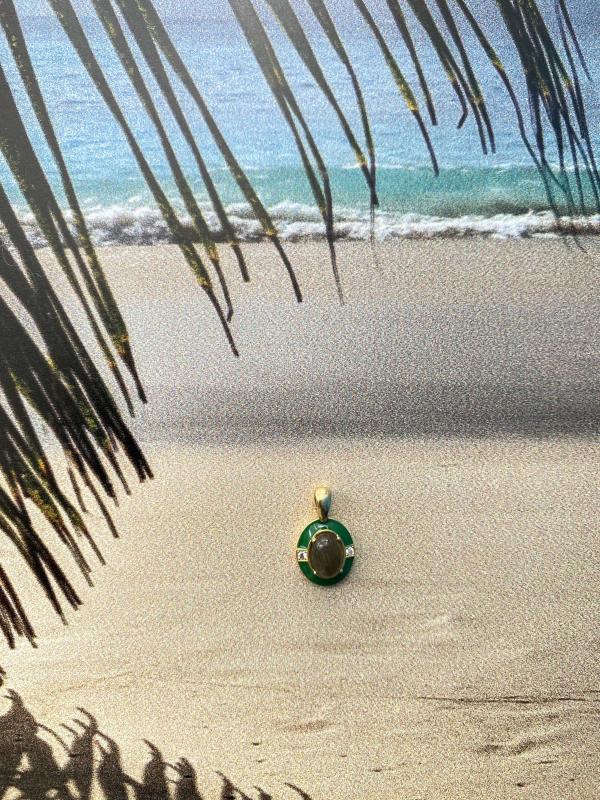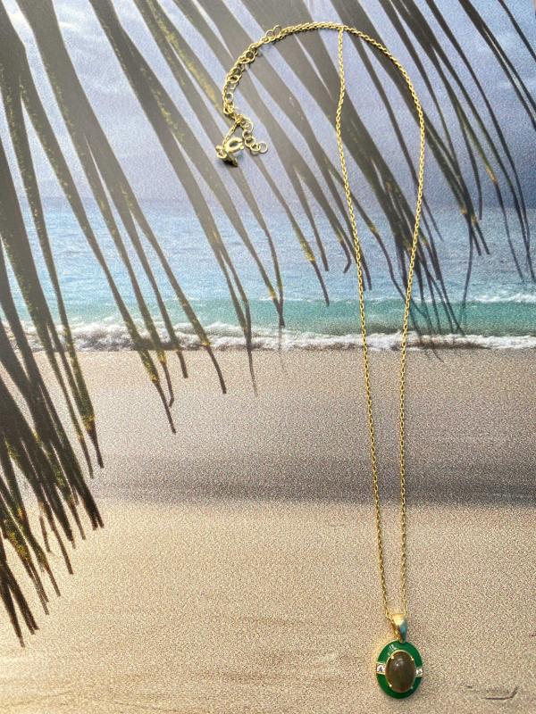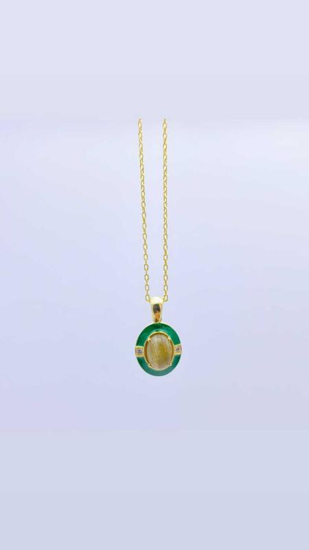 Oval formda Çerçeveli mine işlemesiyle renk verilmiş kolye . Kolyemiz zincir dahil 925 ayar gümüştür. 14 ayar altın yaldız ile kaplama olup altın rengindedir. Kenarlarında İki Adet zirkon taş detayı vardır. Ortasında bulunan Labrodorit taşıdır. Gayet , sade ve şık günlük kullanıma veya kombinlere uygun tasarım. Ürün kopça sayesinde farklı zincirlerinizle de kullanmaya uygundur. Ağırlık toplam 3 gramdır. kolye ucu Boyutu : 1,5 cm Zincir Uzunluğu 44 cm. Ek uzatma halkaları da dahil edilirse toplam 49 cm dir.