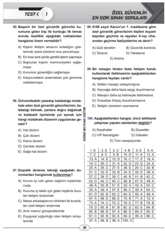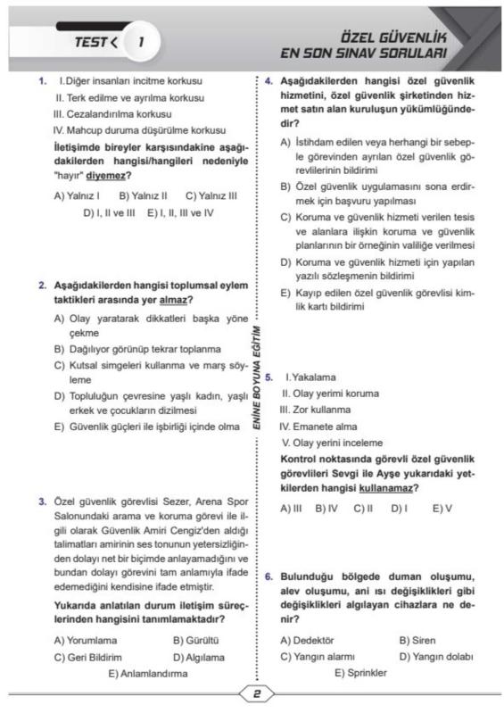 Özel Güvenlik Eğitim Seti (Silahsız) %100 Kazanacaksınız Özel Güvenlik Sınavını Kazanmak ve Belgesini almak isteyenler içindir. Silahsız Sınav İçindir Özel Güvenlik Temel Eğitim, Özel Güvenlik En Çok Çıkan Sorular, Özel Güvenlik Çıkacak Sorular, Özel Güvenlik Hazırlık Kitabı, Özel Güvenlik Hızlı Tekrar, Özel Güvenlik Denemelerinden Oluşmaktadır. Başka kaynağa ihtiyaç bırakmayacak şekilde hazırlanmıştır. Türkiye’de İLK KEZ Özel Güvenlik Hazırlık Setidir 1450 Soru ile son 5 yılın bütün soruları bilgisayar sistemlerine yüklenmiş ve en çok çıkanlar kitaplaştırılmıştır. Kolay kullanım için spiralli olarak hazırlanmıştır. Büyük boy olarak hazırlanmıştır. Daha önceki setlerimizde olan eksiklikler giderilmiş ve en güncel hali hazırlanmıştır. Özel Güvenlikçi Olmak İsteyenler için en ideal kaynaktır. Hadi ne duruyorsunuz günümüzün mesleğinin belgesini alıp kalifiye eleman olalım. Özel Güvenlik Eğitim Seti (Silahsız) Soru Bankası İçerisinde; Özel Güvenlik EN SON Sınav Soruları (100 Soru) 8 Temel Eğitim ve Yenileme Eğitimi Soruları yer almaktadır (800 Soru) 1 Temel Eğitim Denemesi Soruları (100 Soru) Son Yılın EN ÇOK Çıkan Soruları (200 Soru) Hızlı Tekrar Notları Renkli (13 Sayfa) Ders Notları Kitabı (105 Sayfa) Cilt Özellikleri : Sarff 450Mic. A4 Şeffaf Kapak (Sert Kapak) Şeffaf kapağın altında kitabın renkli kapağı yer almaktadır. Sert Kapak (Dış Kapak) Özellikleri: 450 Micron Buzlu Şeffaf Kapak (Sert Kapak) Kraft Cilt (Arka Kapak) Özellikleri: Kraft Kağıt ham maddesi odun selülozudür. Suya dayanıklıdır. Kopma mukavemetlidir. Neme dayanıklıdır. Helezon Özellikleri: Sarff 14 mm Pvc Helezon Spiral Şeffaf (4:1) flament çapı 1,8 dır.