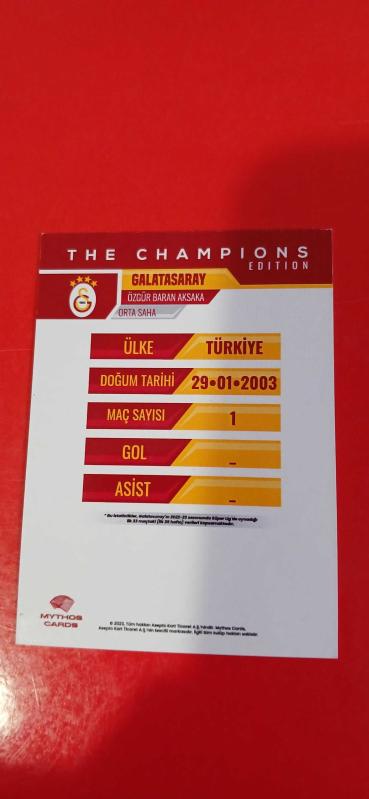 Özgür Baran Aksaka Galatasaray Champion Edition 2022/23 Mythos Cards başlıklı antika/koleksiyon objesi Türkiye menşe’lidir. 2000 ve sonrası dönemine aittir.